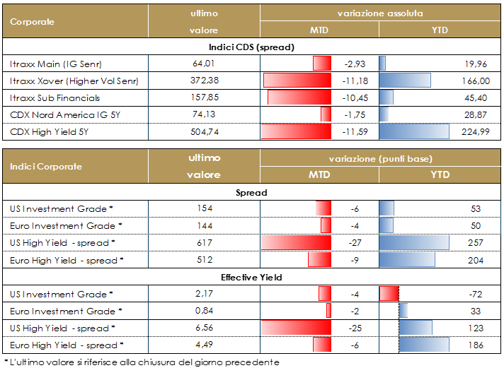 PERFOMANCE DEI TITOLI CORPORATE – Dati aggiornati alle 17.30 del 3 luglio 2020 VIEW STRATEGICA Corporate IG: l’easing monetario potrebbe sostenere ulteriormente l’asset class da preferire, soprattutto in Europa, rispetto al segmento più speculativo (high yield) e a quello governativo in quanto presenta un profilo rischio/rendimento i più interessante in questa fase di difficile previsione dell’evolversi dei rischi di scenario.Corporate HY: Nonostante un ulteriore deterioramento dello scenario base potrebbe impattare gli emittenti più deboli riportando a livelli più elevati i tassi di default, l’entità delle politiche monetarie e fiscali si configurano come possibili elementi di stabilizzazione.
