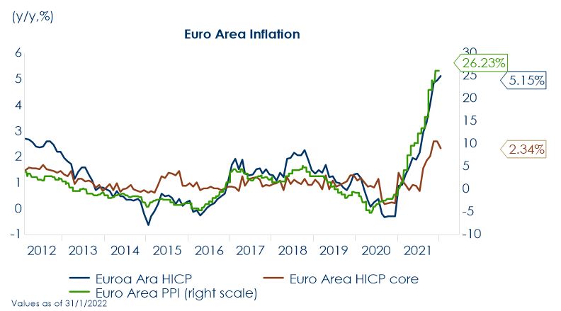 | Nella riunione di gennaio, la BCE ha mantenuto invariata la propria politica monetaria: la BCE ha confermato che gli acquisti netti di asset nell’ambito del PEPP termineranno alla fine di marzo e che la fase di reinvestimento continuerà almeno fino al termine del 2024, mentre per ora la banca centrale continuerà a sostenere l’economia attraverso gli acquisti netti di asset nell’ambito dell’APP.