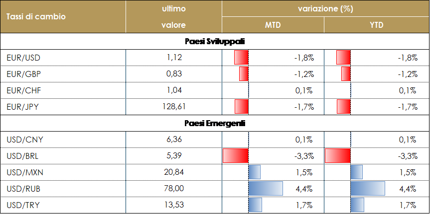 Il prezzo del petrolio tocca nuovi massimi sopra i 90 dollari al barile. Durante la settimana l’OPEC+ ha confermato (come da attese) l’attuale offerta giornaliera di +400.000 barili anche a marzo, in linea con l’accordo in essere fra i produttori e non assecondando minimamente le richieste di una maggior produzione espressa dai consumatori. L’unica novità è la disponibilità ad un aumento dell’offerta, ovvero un ritorno alle normali produttività dei singoli senza il sistema delle quote, qualora i costi del greggio salissero eccessivamente. Una disponibilità legata a timori che nel medio termine si possa verificare una riduzione dell’offerta russa, dovuta a possibili sanzioni USA. Resta, infatti, altissima la tensione fra USA e Russia (sull’Ucraina) e le quotazioni del metano (sia europeo che statunitense) restano sostenute ma lontane dai massimi. Le scorte settimanali EIA di petrolio sono uscite in contrazione a -1,04 milioni, contro attese di +1,05 milioni di barili. TASSI DI CAMBIO Come già accaduto in passato, una riunione della BCE non particolarmente attesa dagli investitori, si è trasformata nella più grossa novità per il mercato da inizio anno, con il potenziale per modificare le dinamiche del mercato FX. Il presidente della BCE ha tenuto una conferenza stampa molto più hawkish delle attese, aprendo la porta alla fine anticipata del QE e, soprattutto, alla possibilità di aumentare i tassi già quest’anno. Il complesso dei tassi europei ha registrato, in particolare sul tratto monetario della curva, uno dei maggiori movimenti degli ultimi anni, sostenendo fortemente l’euro. La moneta comune ha terminato la settimana apprezzandosi contro il dollaro di quasi il 3%. Si è apprezzata dello stesso importo contro quasi tutte le valute dei mercati emergenti. La decisione della BCE di unirsi alle altre banche centrali (come la FED e la Banca d’Inghilterra) nel processo di normalizzazione della politica monetaria, ha il potenziale per cambiare il destino della valuta, sostenendola più del previsto. L’impressionante movimento contro l’EUR ha condizionato la performance del dollaro USA contro tutte le altre valute. Ha perso il 3% contro l’EUR, la SEK e la NOK, mentre è riuscito a contenere la perdita contro lo Yen a meno dello 0,5%. Le valute dell’Europa centrale sono state le migliori tra quelle dei mercati emergenti. Lo Zloty polacco, il Fiorino ungherese e la Corona ceca hanno guadagnato quasi il 4% contro il biglietto verde. Le banche centrali di questi paesi stanno già aumentando i tassi: l’inclinazione hawkish della BCE potrebbe indurle ad essere al margine ancora meno accomodanti di quanto previsto in precedenza dal mercato e questo potrebbe sostenere le loro valute. A cura del team obbligazionario di Mediobanca SGR |