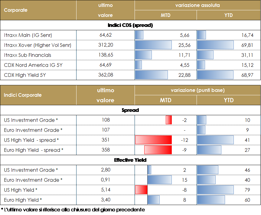 La settimana è stata ancora una volta in questo inizio anno negativa per i mercati del credito; dopo una partenza in parziale controtendenza con flussi positivi e una buona fase di mercato primario, nella giornata di giovedì la conferenza post riunione della ECB, con la conferma di una sempre più prossima fase di restrizione delle politiche monetarie, ha determinato una fase di vero e proprio selloff sia sui titoli governativi che sui corporate. I timori sulla minore transitorietà dell’inflazione portano direttamente a considerare le politiche espansive e in particolare i programmi di acquisto titoli, che tanto avevano aiutato l’outlook del mercato del credito, come passibili di una pronta e inevitabile revisione. La considerazione inoltre sulla maggiore dipendenza delle decisioni di politica monetaria rispetto ai dati macro, comune a quanto deciso dalla Fed la settimana scorsa e anticipata di poche ore dalle decisioni della Bank of England, introduce nel mercato ulteriore incertezza e volatilità che certamente non favorisce la dinamica degli spread. Gli indici CDS di cui riportiamo settimanalmente Itraxx Xover e CDX HY rispettivamente su Europa e US, hanno fatto segnare +30bp in Europa e +20 negli Stati Uniti. Più moderato, ma comunque importante rispetto al livello assoluto degli spread, il widening degli indici IG con CDX IG e Itrxx Eur Main in allargamento di 4bp e 6bp rispettivamente. Gli indici cash dopo una buona partenza della settimana hanno sofferto sia l’allargamento degli spread che la repentina risalita dei tassi chiudendo con performance negative superiori a 1% in Europa e più contenute ma comunque negative in US. Sul primario diverse operazioni corporate ad inizio settimana, in particolare su HY. Segnaliamo i deal di Loxam (B+ 350Mio 4.5% 5y), Whs Promontoria (B 340Mio, 5y, 6.375%, 250Mio Frn e+612), FIS Group (B 350Mio 5.625%, 5y) e Sakza Group (BB- 500Mio 5y 3.875%). Su investment grade il deal subordinato di Terna (BBB- 1Bio 2.375% perp nc 6y) e il double tranche di IBM (A-, 1Bio each, 0.875% 8y e 1.125% 12y) Ancora limitati i nuovi deal sul settore finanziario dove segnaliamo un senior non pref di La Banque Postale (BBB, 500Mio, 1%, 5y) e Goldman Sachs (BBB+, 1Bio Fixed 7y 1.25% e 1.25Bio Frn 3y e+100bp). A cura del team obbligazionario di Mediobanca SGR VIEW STRATEGICA Corporate IG: Il livello e le valutazioni degli spread rendono vulnerabile l’asset class rispetto alle variazioni dei tassi e all’inizio della normalizzazione delle politiche monetarie e potrebbero risentirne della volatilità che prevediamo in aumento. La ricerca di rendimento, la stagionalità che torna positiva e l’offerta netta contenuta prevista rimangono fattori tecnici supportivi. Esprimiamo una view neutrale. Corporate HY: Outlook neutrale dati i livelli raggiunti dalle valutazioni nonostante alcuni fattori, prevalentemente tecnici, e la ricerca di rendimento in assenza di alternative nel campo obbligazionario ci rendono costruttivi verso l’asset class ma necessariamente selettivi dato il prevedibile aumento del rischio idiosincratico in questa fase del ciclo. |