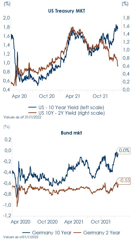 La settimana sui mercati dei titoli governativi è stata dominata dalla riunione della BCE, che ha aperto la porta ad un possibile rialzo del costo del denaro già nel corso del 2022, e ad una futura anticipazione della fine dei piani di QE (cfr. il punto della settimana). Conseguentemente si è registrato un ampio rialzo dei rendimenti obbligazionari, in particolare sul tratto monetario della curva. Nel dettaglio il cambiamento delle attese ha portato il rendimento del titolo governativo tedesco a 2 anni ai massimi dal 2015, e quello dei titoli a 5 anni positivo per la prima volta dal 2018. Le parti più lunghe della struttura a termine hanno sovraperformato proseguendo il movimento di bear-flattening in atto da gennaio. Il differenziale 5-30 anni ha raggiunto un minimo dal 2008, riflettendo i timori che un avvio anticipato del ciclo di rialzo dei tassi possa pregiudicare la crescita futura. La prospettiva di una fine anticipata del programma di acquisti ha avuto un impatto anche sullo spread BTP -Bund che, dopo il minimo a 130bps, fatto segnare a seguito della rielezione di Sergio Mattarella a presidente della Repubblica, è tornato ad aumentare. Anche la riunione della BoE ha comunque riservato qualche sorpresa hawkish per i mercati: nella riunione di febbraio la BoE ha alzato il costo del denaro allo 0,50% dal precedente 0,25% deciso solo a dicembre, con quattro voti di dissenso all’interno del MPC che avrebbero voluto un aumento del costo del denaro di 50 punti base. Questa sorpresa hawkish è stata anche riflessa nel linguaggio nel verbale della riunione, dove l’MPC ha notato che “un ulteriore modesto irrigidimento della politica monetaria sarà probabilmente appropriato nei prossimi mesi”. Con voto unanime, è cambiato anche il target del programma di acquisto di titoli: è stata confermata la parte di 875 miliardi di sterline di Gilt, ma non verranno più re-investiti i titoli in scadenza; inoltre, viene azzerata la quota di corporate bond (in precedenza di 20 miliardi). La fine del programma di acquisti resta, per ora, fissata alla fine del 2023. Si concretizza, pertanto, l’attesa accelerazione restrittiva anche da parte della BoE (di pari passo con l’azione della Fed), costretta nuovamente ad agire sui tassi a causa del forte rialzo dell’inflazione. Il tema centrale della riunione di gennaio della BoE è stato il desiderio di contrastare gli effetti secondari derivanti dall’aumento dell’inflazione, in particolare legati alle pressioni salariali. La BoE ora pensa che la crescita salariale sottostante salirà a circa il 4,75% nel corso del prossimo anno, data l’alta inflazione, un mercato del lavoro rigido. A contempo, negli Stati Uniti, gli interventi verbali di alcuni presidenti di banche regionali della Fed hanno suggerito un approccio più graduale all’aumento dei tassi, compresi gli elettori del FOMC del ’22 che hanno cercato di calmierare le attese di un rialzo dei tassi a 50pb già a marzo, pur ribadendo la necessità di rimanere data dependent. VIEW STRATEGICA Governativo US La Federal Reserve ha deciso di accelerare il tapering nel meeting di dicembre, mentre l’avvio del ciclo di rialzi dei tassi, non avverrà prima dell’estate 2022. Questo causerà molto probabilmente un moderato aumento dei tassi a lungo termine negli Stati Uniti. Esprimiamo una view neutrale, poiché i livelli raggiunti assicurano un carry positivo Governativo EU: Continuiamo ad avere una view negativa sui rendimenti obbligazionari europei, aspettandoci una perdita di valore sia dalla componente carry che dalla componente prezzo |
