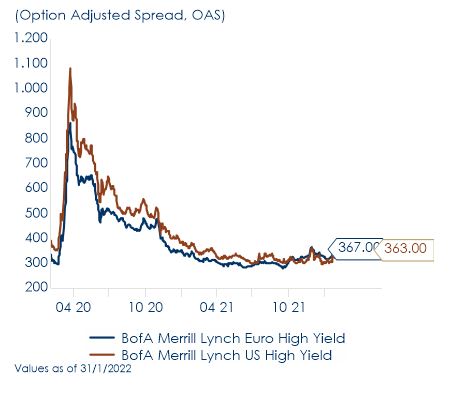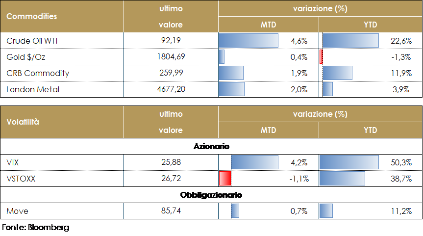 L’inizio del 2022 sarà ricordato per la svolta hawkish delle principali banche centrali incalzate dai livelli record d’inflazione. La rimodulazione delle aspettative di politica monetaria ha generato rendimenti negativi in quasi tutte le asset class. I rendimenti obbligazionari globali sono aumentati sulla scia dell’aumento dei rendimenti dei Treasury statunitensi. Il forte aumento del tasso di sconto ha a sua volta pesato sulle azioni globali. Le azioni statunitensi sono state le peggiori tra le principali borse mondiali, seguite da quelle dell’Area Euro e dei mercati emergenti. Le azioni del Regno Unito sono state le uniche ad apprezzarsi durante il mese di gennaio.