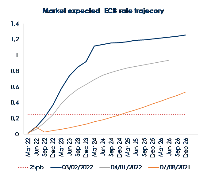 Nonostante ciò, la riunione ha riservato non poche sorprese, traducendosi di fatto in una svolta hawkish del Consiglio Direttivo, che seppur unanime nel dichiararsi preoccupato per l’aumento dell’inflazione, visti gli ultimi dati sui prezzi al consumo (Fig.1 e 2) è rimasto diviso sul mantenere o meno invariate le misure di politica monetaria. Anche la pubblicazione odierna del sondaggio dei previsori professionisti ha riportato un ulteriore aumento delle aspettative di inflazione su tutti gli orizzonti. I previsori stimano ora l’inflazione principale di quest’anno con una media del 3,0% annuo, mentre la previsione per il 2023 è ora allineata alle proiezioni della BCE di dicembre, all’1,8% annuo. Le aspettative a lungo termine sono invece salite ulteriormente dall’1,9% al 2,0%, tornando al target per la prima volta dal 2013(Fig. 3). Lo Statement iniziale ha riservato poche novità: la BCE, cancellando il riferimento alle attese di un calo dell’inflazione nel corso dell’anno, ha riconosciuto che l’inflazione resterà elevata più a lungo di quanto atteso a dicembre (e con rischi sbilanciati verso l’alto), mentre le prospettive di crescita potrebbero restare contenute nella prima parte dell’anno (con rischi bilanciati), a causa sia delle misure di contenimento e degli alti prezzi dell’energia, che pesano su consumi e imprese, che delle perduranti strozzature delle catene di produzione. Nella sessione di Q&A, è emerso che il sentiero dei prezzi atteso dalla BCE è ben più alto di quanto riflesso nelle previsioni di dicembre. La conseguenza implicita in queste valutazioni è una restrizione monetaria in tempi più stretti rispetto a quanto delineato dalla BCE alla fine dello scorso anno, come evidenziato anche dal fatto che la Presidente Lagarde non ha più definito come “molto poco probabile” un rialzo dei tassi quest’anno. Considerata l’incertezza dello scenario economico, la Presidente della BCE ha comunque sottolineato ancora la necessità di una gestione flessibile della politica monetaria, rimarcando che le aspettative d’inflazione restano ben ancorate leggermente al di sotto dell’obiettivo della BCE (2% letto sull’inflazione headline) e che nell’Area Euro non si riscontra un’accelerazione dei salari, diversamente da quanto accade in USA e nel Regno Unito. Una riformulazione della forward guidance è posticipata al meeting del 10 marzo, quando la BCE avrà a disposizione le nuove previsioni e il nuovo assessment sulla congiuntura europea. Conseguentemente il mercato ha ripezzato le proprie aspettative -probabilmente in modo un po’ troppo aggressivo-, anticipando all’estate il primo rialzo del costo del denaro (Fig. 4). La Lagarde ha sottolineato come la BCE rispetterà la tabella di marcia per l’uscita dalle misure ultra-espansive: prima termineranno gli acquisti (al momento l’APP non ha un termine) e poi saranno alzati i tassi. Quindi se la BCE porrà fine al Quantitative easing (QE) all’interno del programma APP alla fine del terzo trimestre il primo rialzo dei tassi non potrà arrivare prima di dicembre. Solo se la BCE decidesse di accelerare la conclusione dell’APP alla fine del secondo trimestre allora il primo rialzo potrebbe arrivare in autunno. |