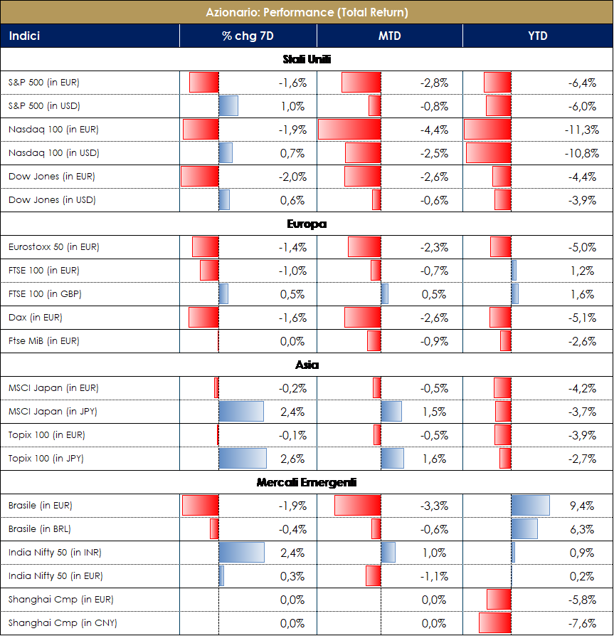 Settimana insolita sui listini azionari con sell-off aggressivi e mai visti prima, soprattutto su large cap, e wording che tradisce le BC e i suoi policy maker. EuroStoxx flat, con la graduale erosione di performance accumulata nei primi giorni della settimana, trainato da Banks +3.50% e BasicResources +2.85% contro il -3% di Retail e Travel&Leisure. Banco de Sabadell, Commerzbank e Deutsche Bank oltre il +12% (positive readXcross dalla BCE e dalla BOE che alza i tassi di 25bps portandoli allo 0.5%) contro il -17% di Orpea. Il timore di un aumento inflattivo resta centrale nel comportamento del mercato e nelle stime prospettiche. Da notare, di positivo, il dato di gennaio sui Nonfarm Payrolls pubblicato nel pomeriggio di venerdì (467K > 125K exp). S&P500 che, nonostante la buona partenza, sprofonda in un -3.57% di giovedì complice il warning di Paypal e soprattutto di Meta (ex Facebook) i quali bruciano in una sola seduta borsistica ¼ del loro valore, registrando un -25% storico. Nello specifico, Meta ha eroso 250 $bln di valore di mercato in un solo giorno…record assoluto per qualsiasi azienda US di sempre. Nasdaq al momento worst performer con un -5.33% registrato giovedì e un -2.50% complessivo nella settimana. Fronte prezzo del petrolio non aiuta certamente il peggioramento della situazione geopolitica con la notizia da parte degli Stati Uniti dell’invio di 2.000 truppe in Europa. Lo stile value registra un +2.65% sul growth a livello globale e +1.65% in Europa, quest’ultima tiene nonostante il tentativo di rialzo del growth infranto, però, nella giornata di giovedì. Mercato italiano flat con FTSE MIB e ITAMID cap a -0.30% (Unicredit a +9% e Saipem -37% dopo il PW e l’annuncio di un necessario aumento di capitale). Tolto il warning di alcuni tech americane, continua bene la reporting season con circa il 60% delle società americane ad aver riportato i numeri del trimestre e dato visibilità sul 2022 contro il 25% europee. Secondo dati Factset, il 77% delle società dell’S&P500 ha riportato una sorpresa positiva sugli EPS e il 75% sulle sales. La crescita degli utili, al 24%, conferma il quarto trimestre con aspettative sopra il 20%, sebbene ad oggi la sorpresa di beat sugli utili sia stata del 4% above exp, inferiore alla media a 5 anni pari a +8%. Ad oggi il mercato punisce maggiormente le sorprese negative, rispetto alla reazione degli investitori, talvolta comunque negativa, ai numeri in linea e/o migliorativi delle società. Le aziende che hanno riportato sorprese positive per il Q4 2021 hanno visto un calo medio dei prezzi di -1,8% da due giorni prima del rilascio dei numeri a due giorni dopo. Le aziende che hanno riportato sorprese negative sui guadagni per il Q4 2021 hanno visto, invece, un calo medio dei prezzi di -3.7%. In Europa, il 25% c.a. dell’SXXE ha riportato il 5% di sorpresa positiva sulle sales ed EPS, EuroStoxx50 a +3% le sales e +6% EPS. “Beat” della settimana: Elis, HeidelbergCement, SIG Combibloc Group, UBS Group, Virgin Money UK, Alphabet, Raiffeisen Bank, Santander, Compass Group, Infineon, Nokia, Publicis Groupe, Siemens Healthineers, T-Mobile, Assa Abloy, Intesa Sanpaolo, Talanx, Vinci, Amazon. “Miss” della settimana: Axalta, Tele2, Electronic Arts, Novartis, PayPal, Telenor, ABB, Align Technology, BBVA, BT Group, Corteva, ING Group, Scatec, Swisscom, Activision-Blizzard (nonostante le news sul bid), Meta. Infine, i desk derivati segnalano flussi retail / HF per lo più incentrati a “ribilanciere” piuttosto che posizionarsi fortemente a favore di uno stile o un altro (value vs growth). A cura del team Core Equity Value di MB SGR VIEW STRATEGICA La view sul comparto azionario continua ad essere costruttiva per un trimestre che, pur con una certa volatilità, presenta una buona crescita degli utili e una stagionalità attraente per le attività finanziarie rischiose. Tra i rischi a questo scenario un certo grado di rallentamento macroeconomico, la normalizzazione della politica monetaria (che potrebbe risentire di un tasso di inflazione più alto più a lungo) e i timori sul mercato immobiliare cinese. |