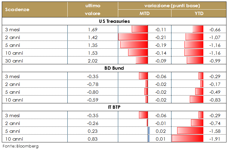 La settimana è stata guidata dal peggioramento del dati macroeconomici, con l’indice ISM manifatturiero che si è attestato al valore più basso dopo la grande crisi e l’indice ISM non manifatturiero che ha registrato un marcato rallentamento. Riteniamo che sugli indici ISM rendano i tempi di un terzo taglio del tasso all’incontro di ottobre, ma non rendono ugualmente probabile che i tagli del osto del denaro diventino pari a 50pb entro al fine del 2019. Conseguentemente la struttura a termine governativa US ha subito una modesta traslazione verso il basso, mentre la struttura a termine dei Bund è rimasta praticamente invariata.