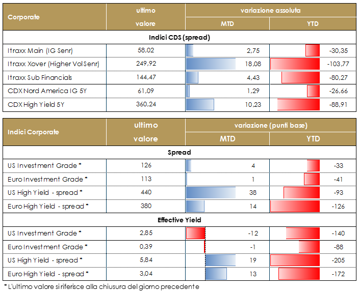 Nella settimana trascorsa il mercato corporate è stato caratterizzato da due fasi distinte: un inizio settimana piuttosto positivo e una fase più negativa a partire da metà settimana con riskoff diffuso e solo in chiusura un accenno alla stabilizzazione. Il mercato primario si è mantenuto ancora piuttosto attivo con emissioni su tutti i comparti in particolare su financials. Su base settimanale, inclusa la giornata odierna, il mercato HY ha avuto performance negativa (sia in Eur che US HY). Su Indici CDS, particolarmente liquidi, la settimana su Itraxx Xover (Hy) si e’ chiusa con un +16 (235 da 252) dopo aver toccato quasi 30bp di allargamento. Itraxx Main (IG) ha chiuso a 58 (+2) mentre Sub Fin a 149 (+4); stessa dinamica, anche se lievemente migliore rispetto all’Europa, in US, con IG (+1) e HY (+5) nella settimana in cui i dati macro (PMI in particolare) hanno continuato a creare debolezza sui risky assets. Sul mercato primario, la settimana è stata ancora intensa. Su corporate non financial nuove emissioni, esclusivamente senior per Ne Property (A- 500Mio Senior 5y 1.875%), Digital Euro Finco (500Mio Senior 8y 1.125%), Ep Infrastructures (500Mio Senior 9y 2.045%), Sga Spa (600Mio Senior 5y 1.375%) e su due emissioni non rated, Royal Mail (550Mio Senior 7y 1.25%) e Ivs Group (300Mio Senior 7y 3%). Su corporate High Yield emissioni per Wind Hellas (525Mio Secured 4y 4.25%), Metinvest (300Mio Senior 5y 5.625%) e Demire Real Estate (BB+ 600Mio Senior 5y 1.875%).Particolarmente attivi gli emittenti finanziari. Su subordinati nuovo AT1 per Aib Group (A- 500Mio Senior Perp nc 5y 5.25%) e Hannover Re (750Mio Subordinated 20ync10y 1.125%); su senior preferred nuova Monte dei Paschi (A- 250Mio 4y 3.625%), Unicredit (BBB 1000Mio 5y 0.5%) e Santander (A- 1000Mio 6y 0.3%). Senior non preferred per Swedbank (A 750Mio Senior non Pfd 5y 0.25%) e senior in Euro per la banca americana Citigroup (1500Mio Senior 8y 0.5%). Anche su covered una emissione nella settimana, ancora Monte dei Paschi (1000Mio 7y 0.875%). A cura del team obbligazionario di Mediobanca SGR