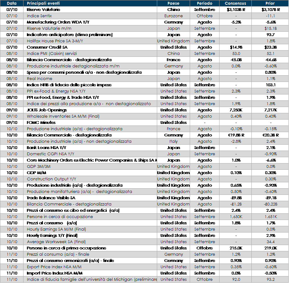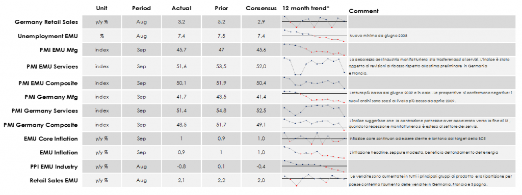 • Europa: in una settimana povera di dati l’attenzione sarà rivolta ai verbali dell’ultima riunione della BCE, anche al fine di valutare l’effettivo consenso all’interno del Consiglio Direttivo del piano annunciato il 12 settembre. Inoltre saranno pubblicati i dati sulla produzione industriale tedesca ad agosto.