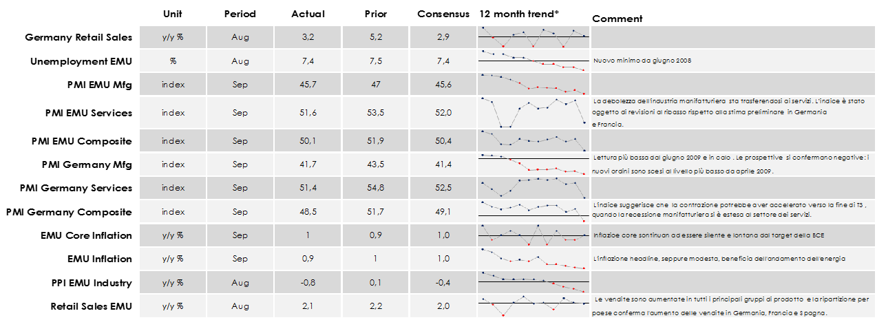 EUROPA: La pubblicazione delle stime finali degli indici PMI relative al mese di settembre confermano un quadro di debolezza marcata per l’economia dell’Area Euro che sembrerebbe essere destinata a rallentare ulteriormente in T4