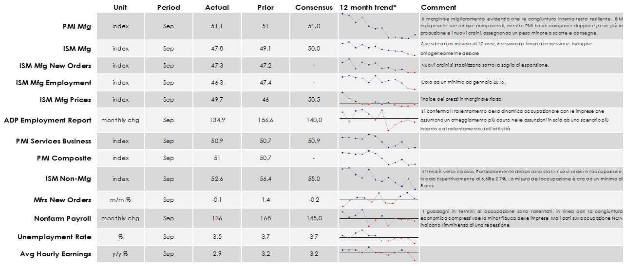 USA: La debolezza degli indici ISM evidenzia che l’elevata instabilità congiunturale causata dalla guerra dei dazi sta minando la fiducia delle aziende US e che la debolezza del comparto manifatturiero si sta estendendo ai servizi.  Entrambe gli indici manifatturiero e non hanno mostrato anche una composizione di fondo piuttosto debole, suscitando preoccupazioni circa un significativo rallentamento dell’economia statunitense verso la fine del 2019. Tuttavia il report sul mercato del lavoro ha continuato a mostrare una crescita costante dell’occupazione.