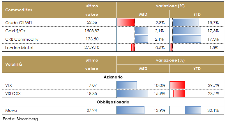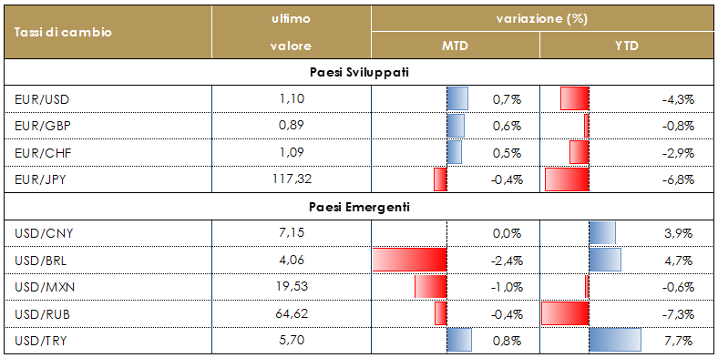 Il mercato dei cambi resta guidato dai di un rallentamento della crescita economica globale, dall’incertezza politica (timori inerenti alla Brexit, alla guerra commerciale) e alle conseguenti possibili svalutazioni competitive. La settimana appena conclusasi è stata volatile per il dollaro. La valuta US si è rafforzata fino a martedì verso le principali valute, per poi tornare ad indebolirsi dopo la pubblicazione degli indici ISM più deboli delle attese. I dati infatti hanno portato ad una rimodulazione delle attese sulla politica monetaria della FED, anticipando le attese del prossimo taglio già nella riunione di ottobre. Infatti, le attese prezzate dai futures sui fed funds attribuiscono una probabilità di un taglio del costo del denaro già il 30 ottobre, pari all’87%, dal 38% stimata a fine della settimana scorsa. Inoltre, la valuta statunitense ha risentito dell’aumento dell’incertezza politica, con la richiesta di impeachment contro Trump avanzata dai democratici.