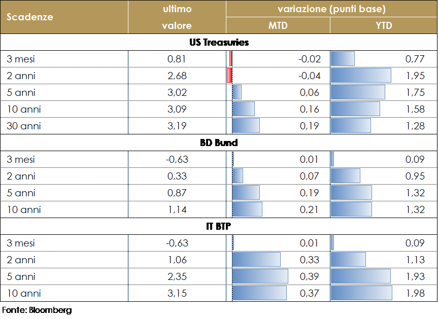 - È ragionevole aspettarsi un rialzo di 50 pb nelle due prossime riunioni, mentre un aumento di 75 pb non è attivamente considerato.