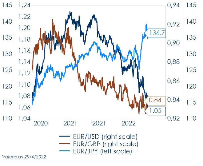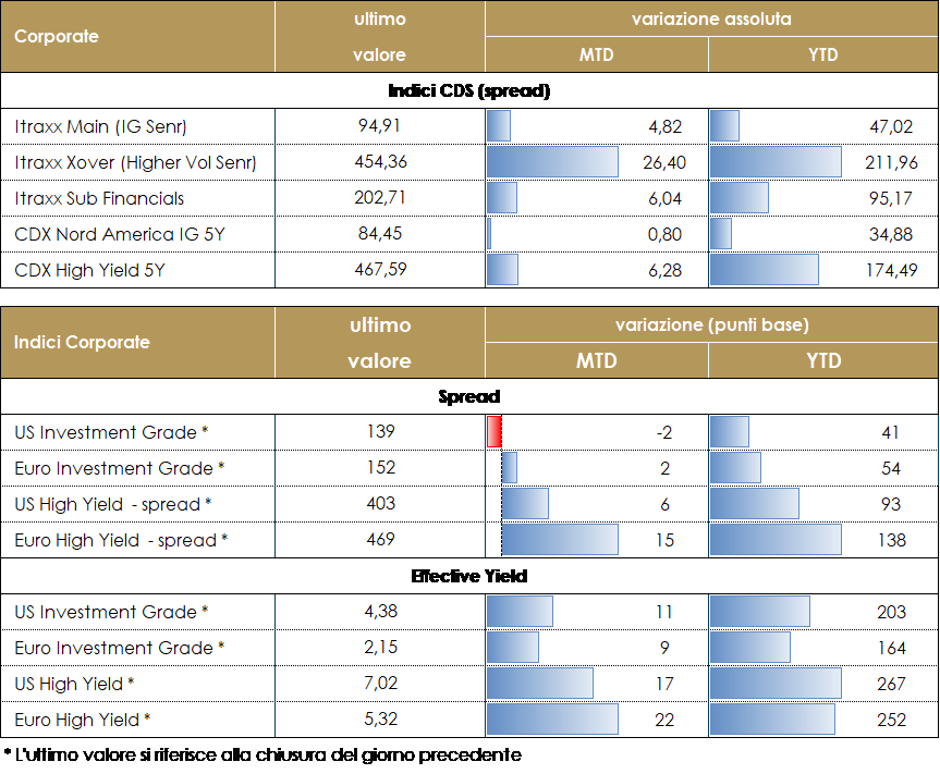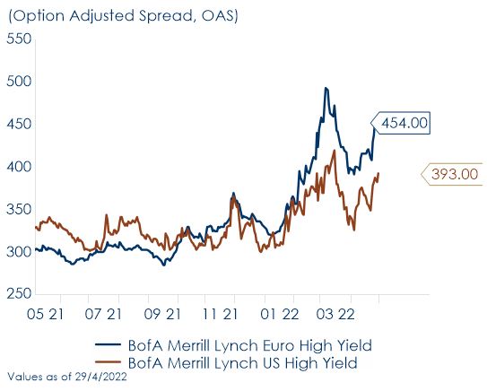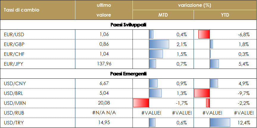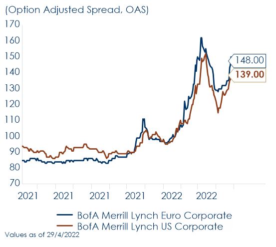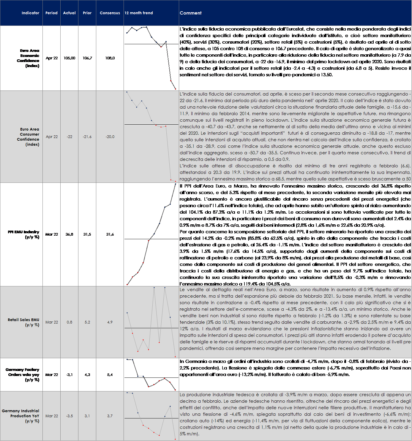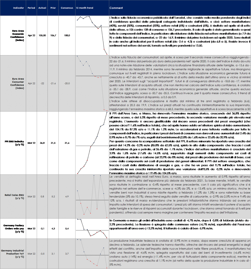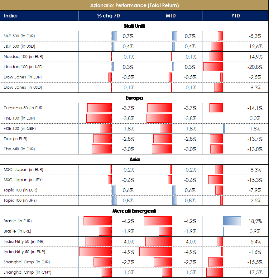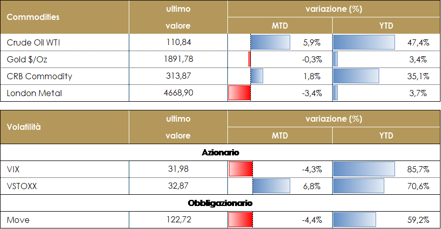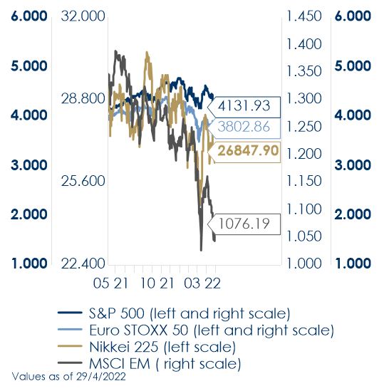 Durante il mese di aprile tutte le principali attività finanziarie globali hanno riportato performance negative. L’aspetto che ha colpito di più è stata la intensità del movimento, che colloca così il mese appena concluso in un insieme molto ristretto di mesi eccezionali. Il mercato azionario (e il mercato del credito) scontano i numerosi timori legate alla revisione al ribasso sulla crescita globale e al rialzo sull’inflazione Il contesto geopolitico, la politica zero-Covid in Cina e le pressioni sui margini legate al rialzo dei prezzi alla produzione hanno spinto verso il basso i mercati azionari, nonostante una stagione degli utili soddisfacente.