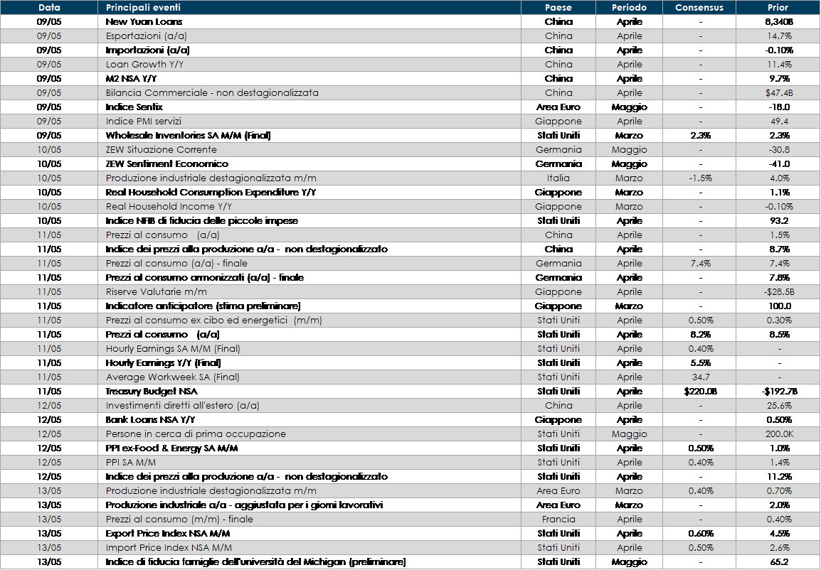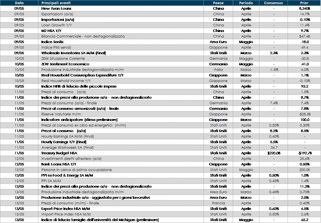 - Stati Uniti: la settimana prossima sarà pubblicato il dato sull’inflazione, CPI, relativa al mese di aprile Completa il quadro l’indice dei prezzi alla produzione, le scorte all’ingrosso, l’indice di ottimismo delle piccole imprese e l’indice dell’Università del Michigan