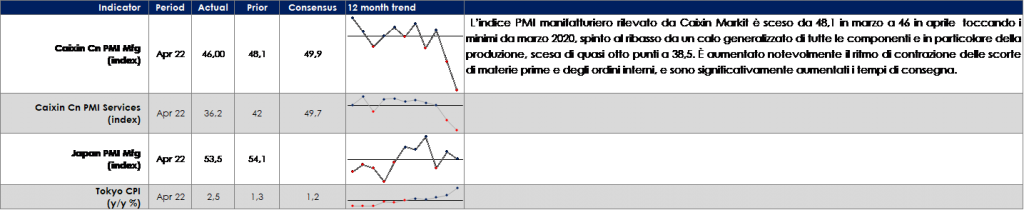 - Asia: In Cina sarà la volta del dato sull’inflazione, dell’indice dei prezzi alla produzione e della bilancia commerciale in aprile. In Giappone verranno pubblicati i dati definitivi da Jibun Bank del PMI dei servizi e composito per il mese di aprile, oltre che il saldo della bilancia commerciale e delle partite correnti.