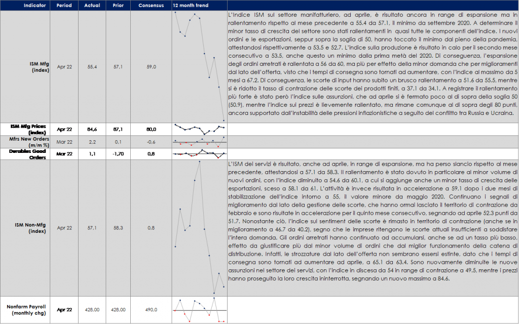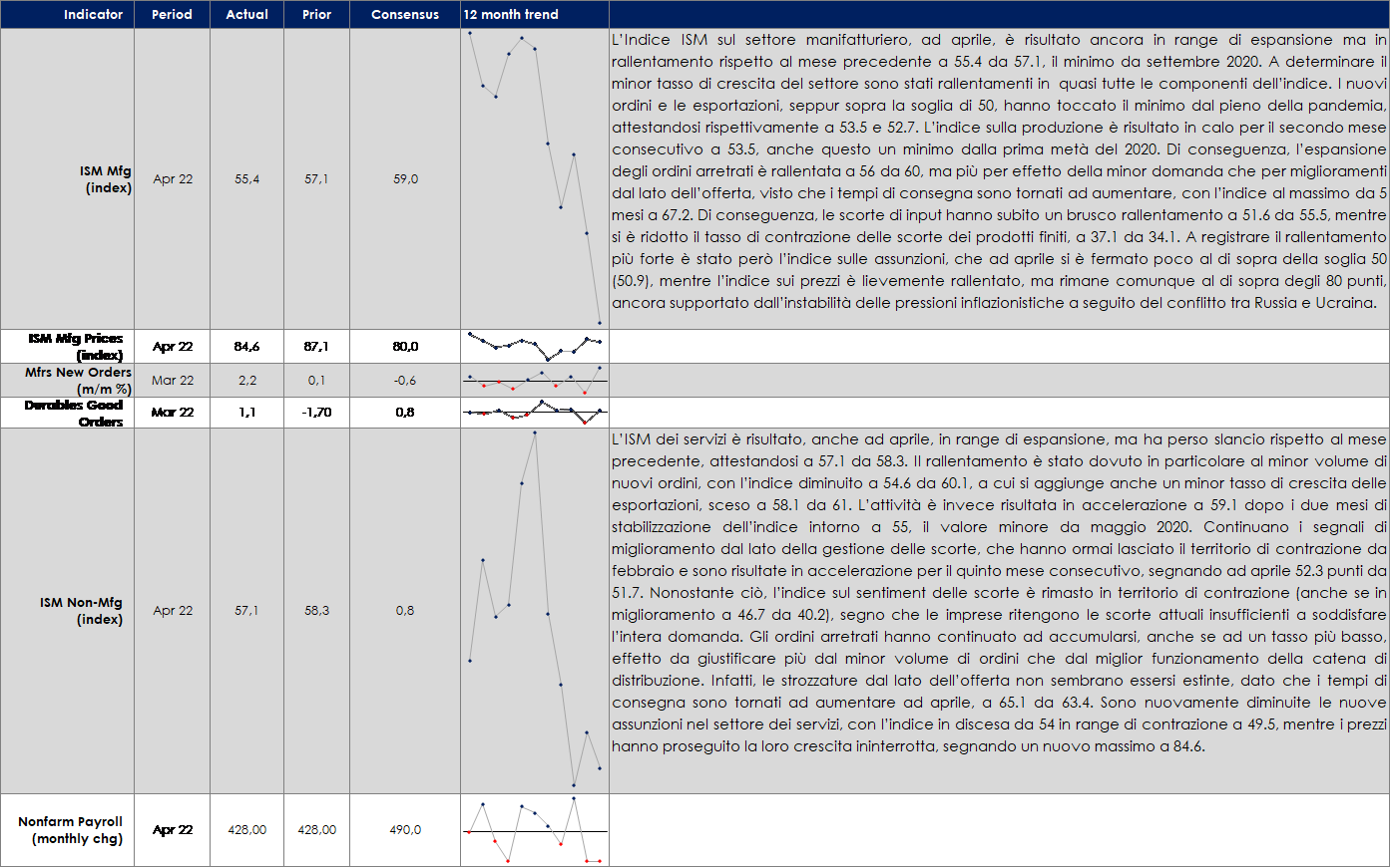 - Come previsto, nella riunione di maggio il FOMC ha aumentato i tassi di interesse di 50pb e rilasciato i dettagli del suo piano di riduzione del bilancio che inizierà a giugno.