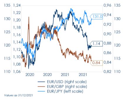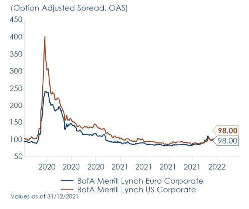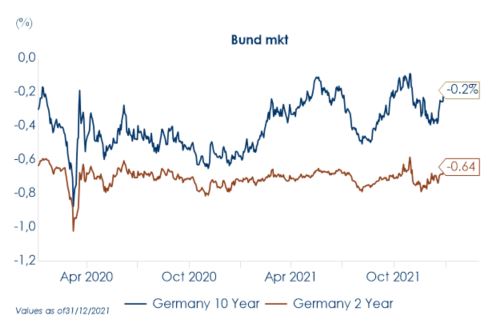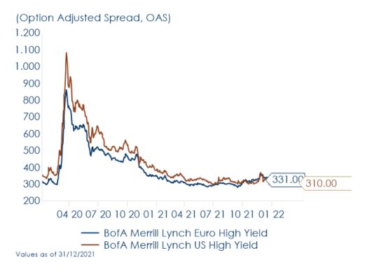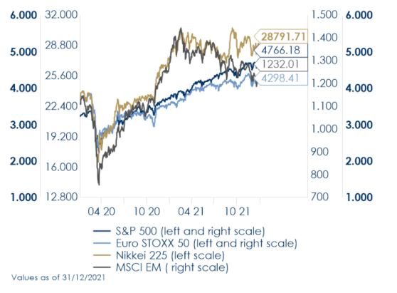 I mercati finanziari hanno chiuso il 2021 su una nota positiva. I principali asset rischiosi hanno registrato guadagni superiori alla media a dicembre, segnalando un’inversione di tendenza rispetto alle perdite di novembre. Da un lato gli investitori hanno soppesato l’impatto per l’attività economica della variante omicron, riducendo le attese del suo impatto sulla crescita economica di lungo periodo dall’altro, i mercati obbligazionari governativi sono stati guidati dai meeting di politica monetaria delle principali banche a cui è seguita a una raffica di annunci hawkish. Il FOMC ha anticipato la data in cui gli acquisti netti di asset raggiungeranno lo zero e ha aperto la possibilità di un rialzo dei tassi a marzo, la BoE ha aumentato i tassi di 15 punti base e la BCE ha annunciato un cauto taper.