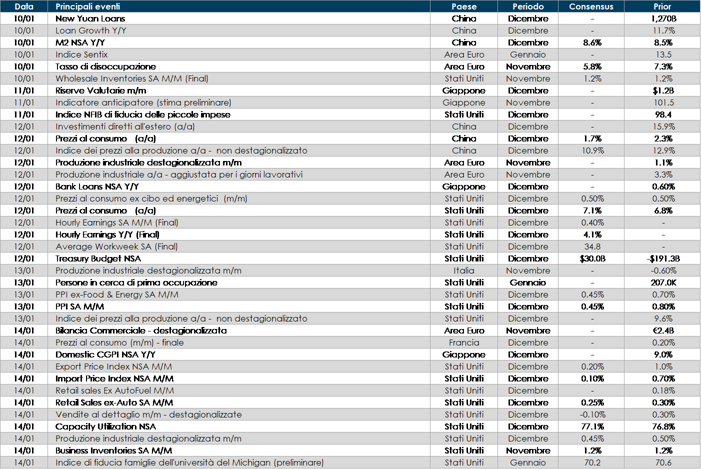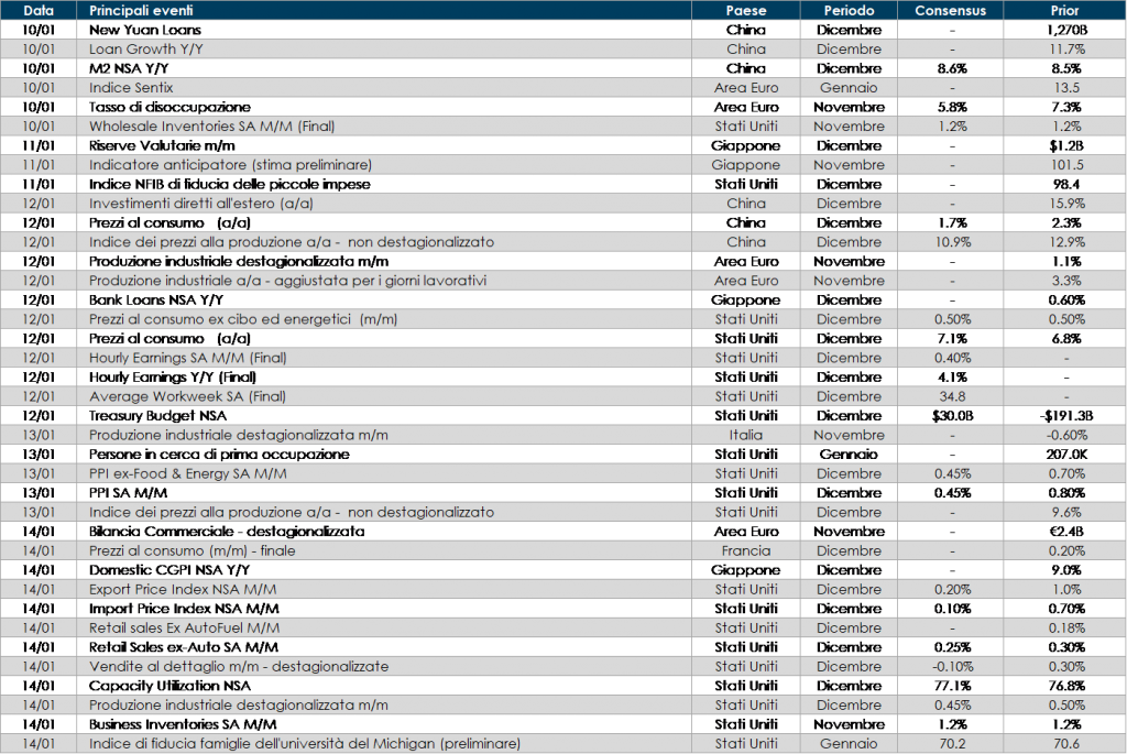 Stati Uniti: Oltre ai risultati pubblicati con cadenza settimanale in merito alle richieste iniziali e continue di sussidi alla disoccupazione e alle nuove richieste di mutuo, verrà pubblicato l’indice dei prezzi al consumo relativo al mese di dicembre ei i dati relativi agli indici dei prezzi alla produzione e dei beni importati. A livello industriale, i risultati più rilevanti riguarderanno le vendite al dettaglio, la produzione industriale e manifatturiera, le rimanenze di prodotti finiti ed il tasso di utilizzo delle capacità produttive. A completare il quadro settimanale ci sarà la pubblicazione della fiducia dei consumatori dell’Università del Michigan.