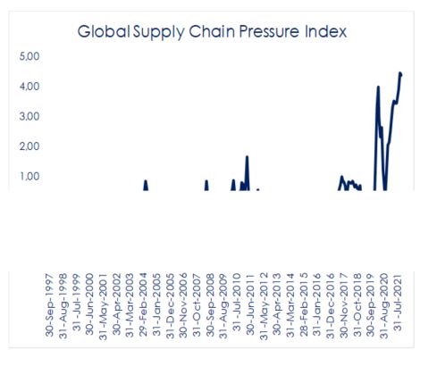 Fig.2: Le condizioni per la svolta dei tassi potrebbero essere raggiunte “relativamente presto” e riguardano il mercato del lavoro. Fig. 3: Le pressioni sulle catene di approvvigionamento globali rimangono alte, ma hanno iniziato a moderarsi