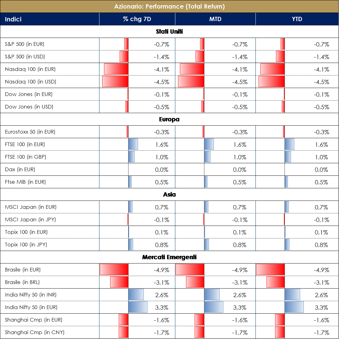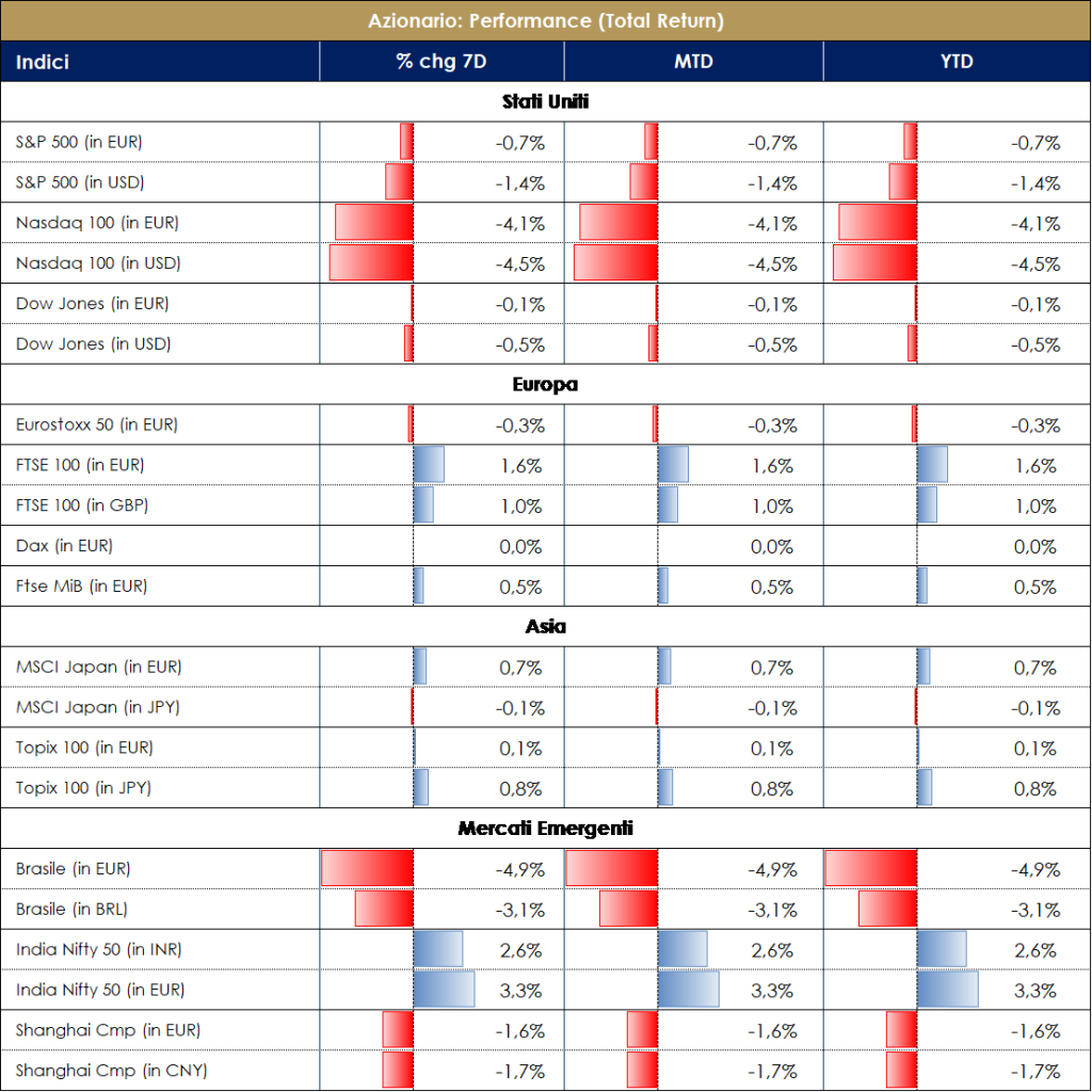 Il presente documento (il “Documento”) è stato preparato dalla Funzione Asset Allocation di Mediobanca SGR SpA (la “SGR”) a scopo puramente informativo. Il documento non ha carattere di offerta, invito ad offrire, o di messaggio promozionale finalizzato all’acquisto, alla vendita o alla sottoscrizione di strumenti/prodotti finanziari di qualsiasi genere. Inoltre, esso non è inteso a raccomandare o a proporre una strategia di investimento in merito a strumenti finanziari. In particolare, il presente Documento non costituisce in alcun modo una raccomandazione personalizzata; lo stesso è stato predisposto senza considerare gli obiettivi di investimento, la situazione finanziaria o le competenze di specifici investitori. Il presente Documento è proprietà di Mediobanca SGR; esso non può essere riprodotto o pubblicato, nemmeno in una sua parte, senza la preventiva autorizzazione scritta della SGR. Le informazioni, opinioni, valutazioni e/o previsioni contenute nel presente Documento (le “Informazioni”) si basano su fonti ritenute autorevoli ed attendibili; tuttavia, la SGR non assume alcuna responsabilità per eventuali errori od omissioni né potrà considerarsi responsabile per le eventuali perdite, danni o conseguenze di qualsivoglia natura (legali, finanziarie o fiscali) che dovessero derivare dal fatto che si sia fatto affidamento su tale Documento. Ciascun investitore dovrà pertanto assumere le proprie decisioni di investimento in modo autonomo, tenuto conto delle sue caratteristiche e dei suoi obiettivi di investimento, e a tale scopo non dovrà basarsi, prioritariamente o esclusivamente, sul presente Documento. I rendimenti passati, eventualmente rappresentati nel Documento, non sono indicativi né garantiscono gli stessi rendimenti per il futuro. Le Informazioni contenute nel presente Documento costituiscono valutazioni aggiornate alla data della sua produzione e potrebbero variare nel tempo, senza necessità di comunicazione da parte della SGR.