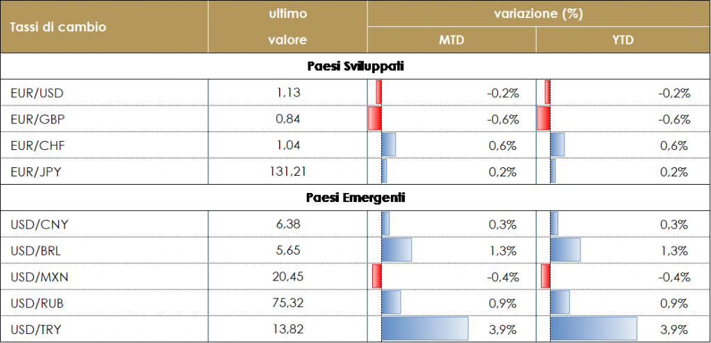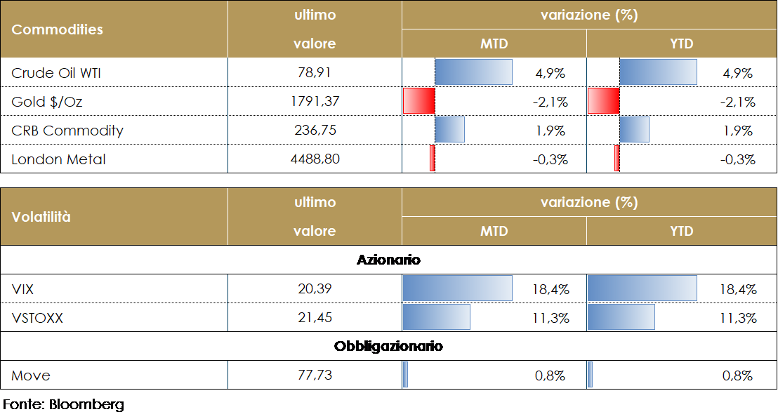 Prezzo del petrolio in rialzo durante la prima settimana del 2022, nonostante l’atteso aumento della produzione annunciato dall’OPEC. Mentre Omicron appare sempre più come una minaccia meno grave per la crescita economica globale, il mercato è scosso dalle diverse interruzioni di fornitura ed particolare i disordini in corso in Kazakistan, dove la rimozione dei controlli sui prezzi del carburante ha scatenato proteste a livello nazionale, con il governo che oggi ha riferito che l’ordine è stato in gran parte ripristinato con l’aiuto delle truppe russe, ma ha comunque ordinato alle forze di sicurezza di “sparare per uccidere senza preavviso” per porre fine definitivamente alle proteste. Allo stesso tempo, la produzione libica continua a diminuire mentre il freddo in North Dakota e Alberta ha portato al rallentamento delle spedizioni all’inizio di questa settimana. L’OPEC+ nella sua riunione di gennaio ha deciso di aumentare di 400.000 barili al giorno la fornitura di febbraio, nonostante l’aumento dei casi di COVID-19 a livello globale evidenziando così la propria fiducia nella ripresa della domanda. In tale contesto, il comitato tecnico dell’OPEC+ stima un’eccedenza giornaliera di 1,4 mln di barili nel primo trimestre, circa il 25% in meno rispetto alle precedenti attese di un mese fa: le previsioni confermano una domanda resiliente, dopo un lieve impatto nel primo trimestre dovuto alla variante Omicron. Contestualmente, le scorte settimanali statunitensi Api hanno registrato un calo di 6,4 mln di barili contro un’attesa di mercato di -3,4 mln, mentre gli stock di benzine sono saliti di 7 mln di barili. Dopo lo storno di fine anno, è tornato a salire il prezzo del gas naturale. TASSI DI CAMBIO La prima settimana dell’anno ha visto il dollaro statunitense apprezzarsi contro tutte le valute del G10. Il movimento non è stato significativo contro i cosiddetti “low yielders” (euro, yen e franco svizzero), mentre il dollaro australiano, il dollaro canadese e quello neozelandese hanno tutti perso più dell’1%. La divisa statunitense si è apprezzata dopo la pubblicazione dei verbali del FOMC di dicembre, mercoledì sera, che hanno mostrato una Banca Centrale decisamente meno accomodante delle attese, che potrebbe aumentare i tassi anche a marzo, molto prima di quanto pensato dagli operatori di mercato. Il successivo movimento al rialzo dei rendimenti governativi ha sostenuto ulteriormente il dollaro contro tutte le altre valute. Il rublo russo ha iniziato il nuovo anno in tono negativo (-2.5% rispetto al dollaro): le tensioni tra Russia e Stati Uniti sull’Ucraina hanno scatenato tra gli investitori il timore che gli Stati Uniti possano nuovamente imporre sanzioni contro la Russia. Anche la Lira Turca ha sofferto durante la settimana durante la settimana: la difficile situazione economica è lontana dall’essere risolta e l’iniziativa del governo di rimborsare ai clienti retail le perdite subite possedendo la lira sembra essere un palliativo temporaneo i cui effetti sembrano già svaniti. A cura del team obbligazionario di Mediobanca SGR |