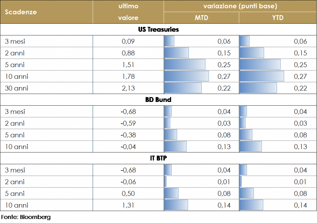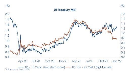 Il 2022 è iniziato con rendimenti obbligazionari in aumento, guidati dalla rimodulazione delle aspettative dei tempi e del ritmo della prossima stretta monetaria. Con i mercati che sembrano aver imparato a convivere con la variante “meno letale” Omicron, le aspettative di politica monetaria rimarranno probabilmente il driver principale per i mercati obbligazionari nelle prossime settimane. I rendimenti dei titoli obbligazionari statunitensi hanno iniziato il 2022 con aumenti significativi, soprattutto nel segmento a lungo termine. L’aumento è stato determinato in egual misura dalle aspettative di ulteriori rialzi dei tassi oltre il 2023 e da term premium più elevati ed associati alle preoccupazioni per una riduzione anticipata e più rapida del bilancio della Fed rispetto a quanto si pensava in precedenza. I verbali del FOMC hanno infatti confermato un’altra svolta hawkish della Fed (cfr. il punto della settimana) In aumento anche i rendimenti dei titoli obbligazionari tedeschi con il decennale Bund che è tornato a quotare vicino a -0.05%, rivedendo i massimi da inizio dicembre scorso. Ad influire sull’aumento dei rendimenti europei in questo periodo dell’anno è anche l’alto volume di emissioni. Per esempio, negli ultimi cinque anni i dieci grandi emittenti di obbligazioni governative europee hanno effettuato in media il 15% dei loro programmi annuali di finanziamento nel solo mese di gennaio; questa cifra è ancora più alta per gli emittenti più piccoli come Irlanda, Austria, Belgio e Portogallo, che hanno spesso emesso più del 20% del loro programma annuale in gennaio. VIEW STRATEGICA Governativo US: la Federal Reserve ha deciso di accelerare il tapering nel meeting di dicembre, mentre l’avvio del ciclo di rialzi dei tassi, non avverrà prima dell’estate 2022. Questo causerà molto probabilmente un moderato aumento dei tassi a lungo termine negli Stati Uniti. Esprimiamo una view neutrale, poiché i livelli raggiunti assicurano un carry positivo. Governativo EU:continuiamo ad avere una view negativa sui rendimenti obbligazionari europei, aspettandoci una perdita di valore sia dalla componente carry che dalla componente prezzo |