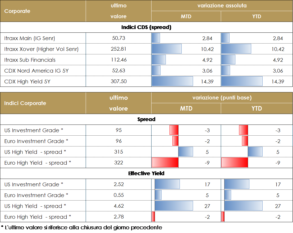 La prima settimana dell’anno sul mercato del credito si è aperta con un tono costruttivo sul mercato secondario e una buona riapertura del mercato primario nonostante le minori sedute operative date dalle festività. Nella seconda parte della settimana sono prevalse le ricoperture e i trade di riskoff dato il movimento sui tassi in risalita e la flessione sui mercati azionari con una sovraperformance relativa del credito rispetto a equity e del mercato cash rispetto al cds. Gli indici CDS di cui riportiamo settimanalmente Itraxx Xover e CDX HY hanno chiuso in allargamento di circa 10bp a fronte di nuove coperture mentre su IG, Itrax Main e CDX IG hanno allargato di 3bp. Gli indici cash hanno invece risentito soprattutto della performance negativa lato tassi, con l’IG US che sottoperforma a causa della maggiore duration con una correzione di quasi due punti percentuali mentre in Europa e nel mercato HY il drawdown è solo marginalmente negativo. Sul primario da segnalare soprattutto deal su bancari tra cui due AT1 in USD per BNP e Calyon oltre a due multitranche senior non preferred per BPCE (BBB+ Senr NP 1Bio 1% 10y, 750Mio 0.5% 6y) e Calyon (A- Senr NP 1Bio 1.125% 10.5y, 750Mio 0.625% 5y) oltre alla emissione per BNP (A- 1.5Bio Senr NP 0.875% 7.5y), BBVA (A- 1Bio Senr Pref 0.875% 6y), Barclays (BBB 1.25Bio 0.877% 6y) e Renault Banque (BBB- 750Mio Senr 0.5% 3.5y). Su insurance nuovo subordinato per AXA (BBB 1.25Bio 1.875% 20nc10y). Lato corporate meno attivo in questo inizio anno con due deal IG, DLR (BBB 750Mio 1.375% 10y) e RTE (A 850Mio 0.75% 12y) e un deal High Yield, Vodafone Ziggo (B+ 750Mio 3.5% 10nc5y). A cura del team obbligazionario di Mediobanca SGR VIEW STRATEGICA Corporate IG: il livello e le valutazioni degli spread rendono vulnerabile l’asset class rispetto alle variazioni dei tassi e all’inizio della normalizzazione delle politiche monetarie e potrebbero risentirne della volatilità che prevediamo in aumento. La ricerca di rendimento, la stagionalità che torna positiva e l’offerta netta contenuta prevista rimangono fattori tecnici supportivi. Esprimiamo una view neutrale. Corporate HY: outlook neutrale dati i livelli raggiunti dalle valutazioni nonostante alcuni fattori, prevalentemente tecnici, e la ricerca di rendimento in assenza di alternative nel campo obbligazionario ci rendono costruttivi verso l’asset class ma necessariamente selettivi dato il prevedibile aumento del rischio idiosincratico in questa fase del ciclo. |