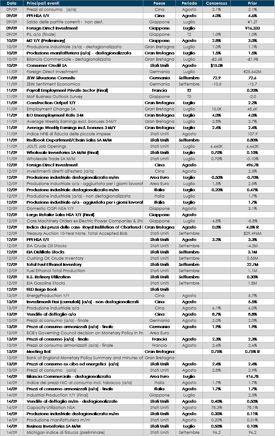 - Stati Uniti: la settimana ha molti dati importanti in uscita negli Stati Uniti, dove l’inflazione di agosto sarà il dato più rilevante; tra gli altri, produzione industriale, vendite al dettaglio e deficit pubblico