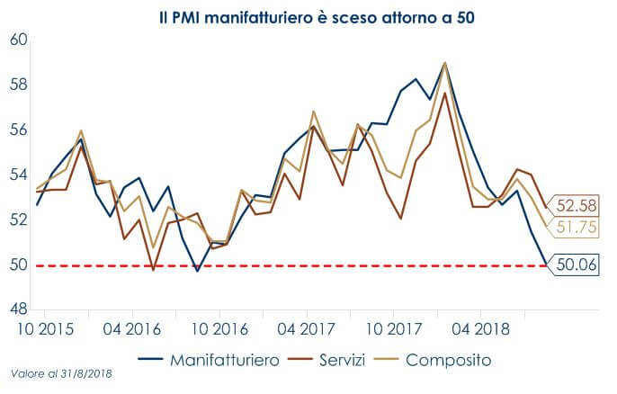 L’indice PMI manifatturiero dell’Area Euro si è attestato a 54,6, invariato rispetto alla stima preliminare e in rallentamento rispetto al dato di luglio (55,1). Il rallentamento è imputabile principalmente ai nuovi ordini, che stanno crescendo al ritmo più basso degli ultimi due anni. Guardando alla scomposizione per paese emerge una notevole divergenza che sta diventando sempre più radicata: Paesi Bassi e Irlanda hanno registrato un miglioramento nei tassi di crescita rispettivamente a 59,1 e a 57,5. Il recupero del PMI servizi a 54,4 dal precedente 54 ha permesso all’indice PMI composito di attestarsi a 54,5 da 54,4. L’indice risulta in lieve aumento rispetto al mese precedente (54,3). La Germania ha rallentato toccando il punto di minimo degli ultimi due mesi di 55,9. Francia e Spagna hanno riportato un ulteriore rallentamento, rispetto alla stima preliminare. Il PMI italiano ha toccato il minimo di 24 mesi. A pesare sul settore manifatturiero dell’Area c’è sia la forza dell’euro registrata da inizio anno sia i timori per la situazione geopolitica (le preoccupazioni per il commercio, la Brexit e situazione italiana). In settimana è stata pubblicata la terza stima della crescita dell’Area Euro in T2 (0.4% t/t), contenente la scomposizione per componenti, che ha confermato che il freno alla crescita è arrivato dal commercio estero per il secondo trimestre consecutivo. Gli ordini tedeschi sono diminuiti dello 0,9% m/m a luglio (consenso 2,2% m/m, dato precedente – 3,9% m/m). La ripartizione mostra un probabile impatto dalle tensioni commerciali e dalla Brexit, con un calo del 3,4% negli ordini esteri, dopo una diminuzione del 4,8% a giugno. I beni capitali sono diminuiti del 5,0% m/m a luglio. Gli ordini interni hanno recuperato e sono rimbalzati del 2,4%, ma una contrazione dell’1,0% negli ordini di beni capitali interni, dopo il calo del 7,7% a giugno, potrebbe far presagire prospettive più deboli per l’economia. Il surplus commerciale della Germania è sceso al minimo degli ultimi quattro anni a luglio a 15,8 miliardi di euro. Il calo del surplus di € 3,2 miliardi è dovuto principalmente a una diminuzione delle esportazioni dello 0,9% m/m dopo lo 0,1% di aumento di giugno. Inoltre, le importazioni hanno accelerato del 2,8% m/m dall’1,3% m/m in precedenza. Nel complesso, i dati indicano che le esportazioni tedesche sono in difficoltà a causa di un calo della domanda estera, mentre la forza dell’economia interna sostiene i consumi. Altrove, la produzione industriale tedesca è diminuita dell’1,1% rispetto al consenso per un guadagno dello 0,4% e un precedente calo dello 0,7%.