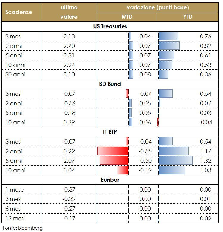 In Europa l’attenzione dei mercati è stata rivolta all’evoluzione della discussione sulla futura Nota di Aggiornamento al DEF Italiano. Le dichiarazioni dei membri di Governo di voler mantenere un rapporto deficit/PIL inferiore al 2% hanno rassicurato gli investitori, guidando una marcata riduzione del differenziale di rendimento dei titoli governativi italiani rispetto ai corrispondenti titoli tedeschi su tutte le scadenze. La BCE nella riunione di politica monetaria della prossima settimana dovrebbe rilasciare un messaggio molto bilanciato, con poche novità nella strategia. L’attenzione sarà rivolta alle nuove previsioni di crescita ed inflazione, che dovrebbero confermare lo scenario di espansione moderata e un graduale aumento dei prezzi, con marginali revisioni al ribasso rispetto alle stime di crescita 2018-2019. Dall’altra sponda dell’Atlantico, i rendimenti dei titoli governati statunitensi sono aumentati sulla scia dei dati macroeconomici particolarmente solidi rilasciati in settimana (ISM e report sul mercato del lavoro). Continua il dibattito su quale sia il sentiero di rialzo del costo del denaro più opportuno da parte della Fed. Se i 25pb di rialzo nel meeting del FOMC di Settembre sono ampiamente attesi e scontati dal mercato (probabilità prezzata dai futures sui fed funds è pari al 95%), l’incertezza è invece rivolta a un possibile quarto rialzo a dicembre. J. Williams, Presidente della Fed di New York, ha confermato che non vi è la necessità di accelerare l’attuale piano di rialzo dei tassi, che rimane adeguato all’attuale situazione economica, che per il momento non mostra segni di overheating, mentre J. Bullard, il Presidente della Fed di St Louis, ha detto che a suo avviso i tassi sono molto vicini alla neutralità per questo la Fed dovrebbe fermarsi e “vedere come sono i dati in arrivo”. Il presidente della Fed St Louis ha, così, sottolineato la differenza fra la sua opinione e quella del mercato e della maggior parte dei suoi colleghi nel FOMC, che invece assegnano un’elevata probabilità a un rialzo dei tassi a settembre. In Giappone il Governatore della BoJ, Haruhiko Kuroda, ha ribadito che non vi saranno rialzi dei tassi nei prossimi per un prolungato periodo di tempo. Kuroda ha anche affermato che l’obiettivo del 2% di inflazione sarà “naturalmente” raggiunto entro la fine del suo mandato nel 2023. |