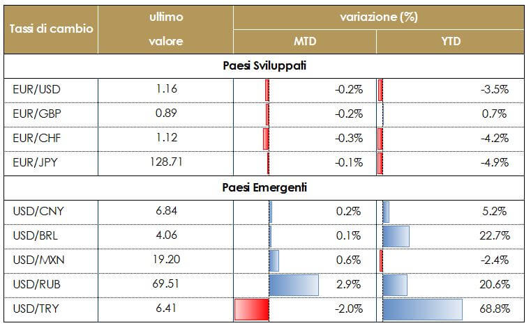 Riteniamo che le dinamiche commerciali e la rimodulazione delle attese future da parte della Fed guideranno il rafforzamento del dollaro fino alla fine dell’anno. La normalizzazione della politica monetaria si sta muovendo a ritmi diversi tra le banche centrali e i mercati hanno rimodulato le aspettative di politica monetaria. La Fed procede il suo percorso di rialzo del costo del denaro muovendosi verso la neutralità, mentre la BCE manterrà i tassi invariati fino all’estate 2019, terminando gli acquisti netti da dicembre dell’anno in corso e la Banca del Giappone ha lasciato la sua politica invariata ma ha rivisto al ribasso le stime sull’inflazione. Si è, dunque, ampliata la divergenza delle politiche monetarie. |