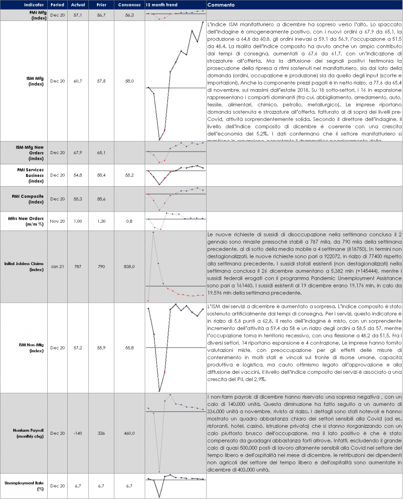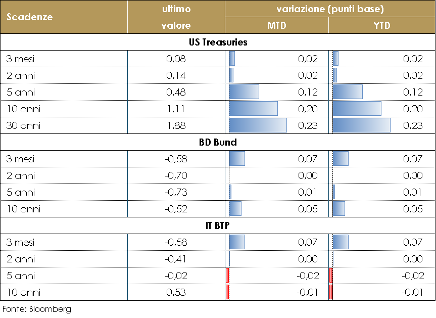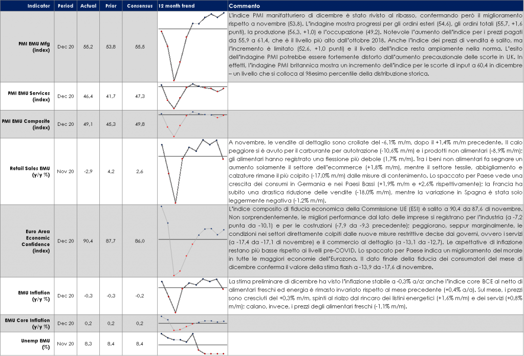MERCATI DEI TITOLI GOVERNATIVI Negli Stati Uniti il nuovo anno è iniziato con due grandi shock politici: (1) il partito democratico ha conquistato i due seggi al Senato nelle votazioni della Georgia, ottenendo così la maggioranza in entrambe le camere del Congresso (2)”l’assalto al Campidoglio”.Il mercato dei titoli governativi USA ha reagito alla vittoria democratica (il rendimento dei titoli decennali sono saliti sopra all’1%), mentre la risposta ai violenti disordini è stata minima. Infatti, sebbene l’elezione in Georgia dia ai Democratici il controllo del Senato solo con il minor margine possibile, i mercati hanno visto in questo risultato un aumenta significativo della possibilità di maggiori stimoli fiscali e quindi di un (seppur contenuto) aumento dei rendimenti a lungo termine e un irripidimento della struttura a termine governativa. In Europa il movimento dei rendimenti dei titoli governativi è stato decisamente più contenuto. Il decoupling dei titoli europei da quelli USA è guidato da attese di una ripresa più lenta della crescita nell’Area Euro e di un’inflazione disancorata dal target della BCE. Influisce anche la divergenza di politica monetaria tra BCE e FED, con la revisione del quadro di riferimento della BCE in corso fino alla metà del 21, la BCE è in ritardo rispetto alla Fed nel convincere il mercato di un potenziale superamento dell’inflazione.