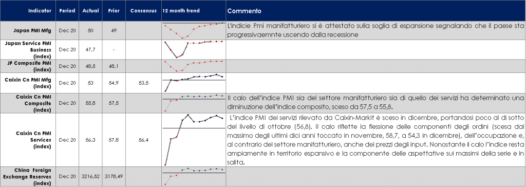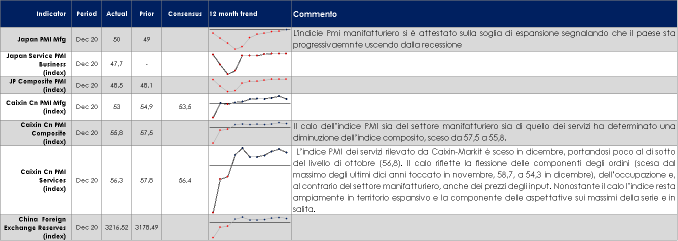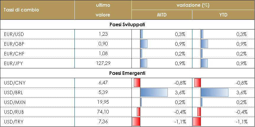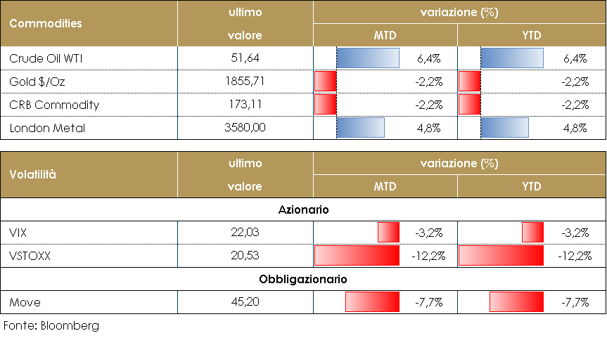 Il primo incontro mensile dell’OPEC+ volto a decidere la produzione del club nei prossimi due mesi si è concluso con un inaspettato accordo articolato in tre punti: (1) l’Arabia Saudita taglierà (unilateralmente) la propria produzione di 1 mb/d a febbraio e marzo, (2) la Russia e il Kazakistan la aumenteranno modestamente per soddisfare il fabbisogno stagionale, mentre (3) gli altri produttori rimarranno ai livelli di gennaio. La decisione dell’Arabia Saudita è risultata inattesa dato che la domanda globale di petrolio in dicembre è stata superiore alle aspettative nonostante il lock-down nei paesi europei. Probabilmente la decisione è frutto dei primi segnali di indebolimento della domanda. La decisione appare inoltre inattesa in quanto consentendo alla Russia di aumentare la produzione, l’Arabia Saudita ha minato da sola i suoi stessi sforzi, iniziati ad aprile, volti a far sì che ogni produttore attuasse tagli simili. Infine, dato che il prezzo del petrolio è al suo livello massimo dallo scorso marzo, rischia di estendere la ripresa della produzione di shale -oil, dato che i prezzi del WTI sono tornati in prossimità dei 50 dollari al barile e possono consentire un’attività più elevata e flussi di cassa positivi (anche se una tale risposta richiederà del tempo per concretizzarsi con i produttori diventati più avversi ad ulteriori sorprese nella produzione OPEC). PERFORMANCE – Dati aggiornati alle ore 17.30 dell’8 gennaio 2021 TASSI DI CAMBIO La prima settimana del nuovo anno ha offerto pochi punti che tuttavia hanno in parte contribuito a correggere il trend di indebolimento del dollaro. Alcuni membri del FOMC, anche se “non-voting members” e i ben noti “falchi”, hanno tenuto discorsi che hanno giustificato l’attuale aumento del rendimento nominale negli USA: questo aumento sembra essere la ragione di un parziale apprezzamento del biglietto verde. Tuttavia, questo non sembra l’inizio di un trend, ma un aggiustamento del posizionamento dei portafogli. Le incertezze legate al coronavirus richiedono un atteggiamento accomodante sia da parte della politica monetaria che da parte della politica fiscale. L’Area Euro appare meno pronta delle sue principali controparti (FED e Bank of Japan) ad accomodare ulteriormente le condizioni finanziarie e per questo motivo l’EUR potrebbe apprezzarsi nelle prossime settimane. Un aumento dei tassi USA, se contenuto nella componente inflazionistica, non dovrebbe nuocere alla visione positiva sulle valute dei mercati emergenti. Essi continueranno a beneficiare delle migliori prospettive globali, della ripresa del commercio globale, dell’aumento dei prezzi delle materie prime e dell’atteggiamento accomodante di politica monetaria da parte delle principali banche centrali. A cura del team obbligazionario di Mediobanca SGR