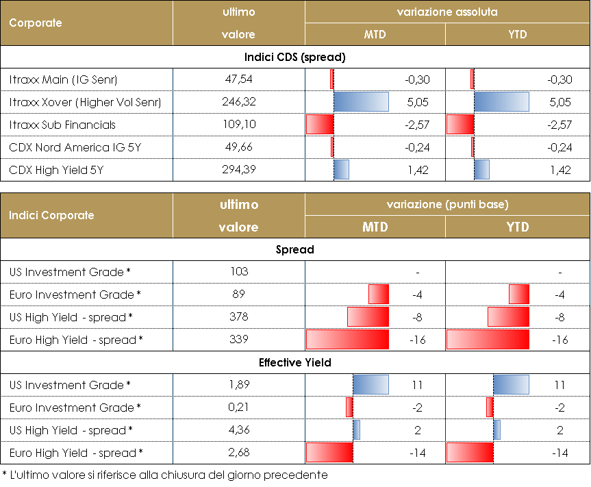 La prima settimana dell’anno sul mercato del credito è stata nel complesso positiva. Gli indici hanno aperto inizialmente in lieve allargamento con alcune coperture ma i flussi sul mercato hanno poi ribilanciato grazie alla consueta ricerca di rendimento che ha permesso, anche al credito, di sfruttare la fase di riskon.Sul mercato secondario i titoli corporate hanno performato positivamente nonostante qualche pressione derivante dalla presenza di nuove emissioni che come di consueto hanno ripreso nella prima settimana dell’anno. Gli indici CDS di cui riportiamo settimanalmente Itraxx Xover e CDX HY hanno chiuso sostanzialmente invariati rispetto ai livelli di fine anno.Sul primario da segnalare diversi deal anche multi-tranche su IG (Bayer, Volkswagen e BMW) con rendimenti molto prossimi ai livelli del secondario. Nuovi deal anche su Finanziari, con i senior di BPCE (due tranches), SocGen, SwedBank, il Sub T2 di Banco Sabadell (10.5nc5.5) e l’AT1 per Abanca (Perp nc 5y).Su HY nuovo deal doppia tranche (5 e 8y) per Adler Group. A cura del team obbligazionario di Mediobanca SGR PERFORMANCE DEI TITOLI CORPORATE – Dati aggiornati alle 17.30 dell’8 gennaio 2021 VIEW STRATEGICA Corporate IG: il supporto della politica monetaria con acquisti diretti e forward guidance su “tassi bassi a lungo” giustificano i livelli compressi degli spread. Nel corso dell’anno il miglioramento del ciclo economico garantirà ulteriore supporto alla solidità dei fondamentali. Manteniamo una view neutrale. Corporate HY: outlook positivo ma possibili fasi di volatilità che potranno rappresentare occasioni di acquisto. Default rate contenuti con picco nel T1, su livelli comunque ridotti rispetto ai cicli precedenti. Supporto al mercato da fattori tecnici positivi e ricerca di rendimento. Manteniamo una view neutrale. |