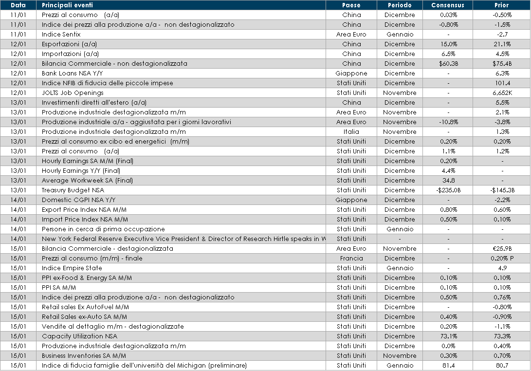 - Europa: Italia, Spagna e Regno Unito pubblicheranno i dati relativi alla produzione industriale a novembre. La Francia inoltre pubblicherà invece i dati sull’inflazione. A livello aggregato sarà pubblicato l’indice anticipatore dell’attività produttiva Sentix, relativo al mese di gennaio.