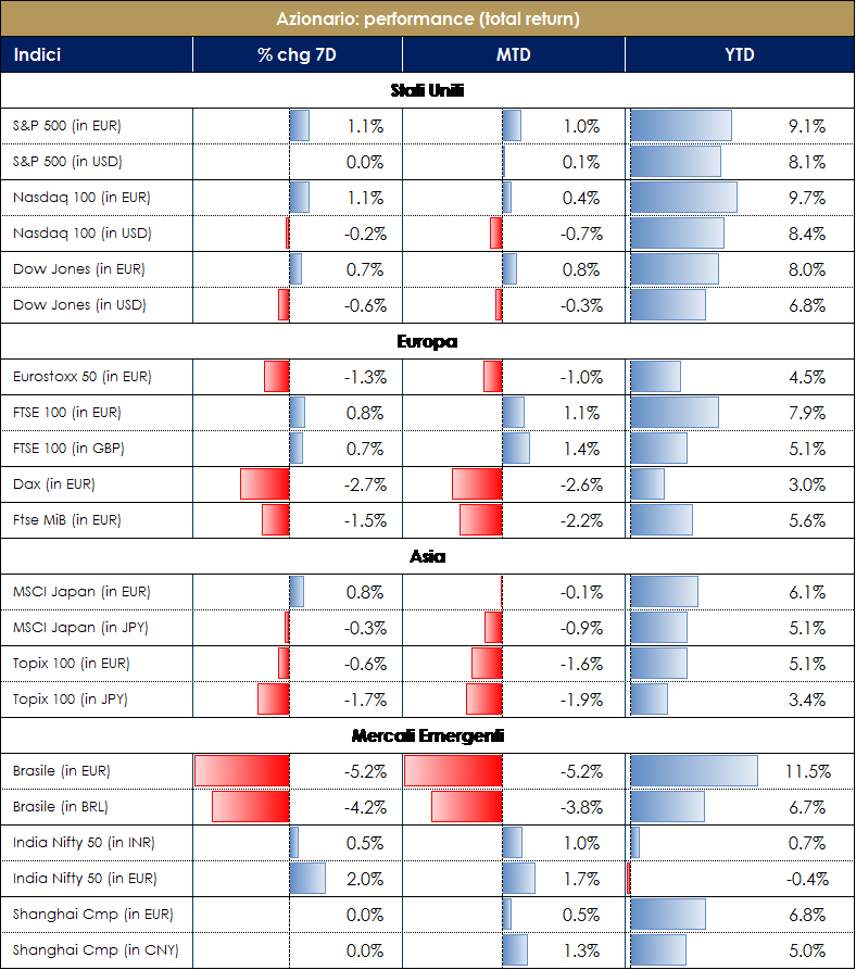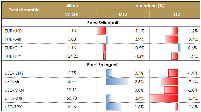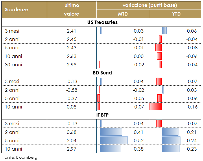 La settimana ha visto la pubblicazione di alcuni dati economici al disotto delle attese (in particolare ISM non manifatturiero negli Stati Uniti, ordini di fabbrica e produzione industriale in Germania) nonché la revisione al ribasso delle aspettative di crescita sia da parte della CE sia della BoE. Conseguentemente i rendimenti dei titoli governativi tedeschi sono scesi lungo tutta la struttura a termine, sulla scia di attese di un BCE che dovrà necessariamente restare più accomodante. Invece, dopo la pubblicazione della revisione al ribasso delle previsioni di crescita ed inflazione da parte della CE, i rendimenti dei titoli di stato italiani sono tornati ad aumentare e il differenziale rispetto ai titoli tedeschi ad allargarsi, riflettendo i timori delle possibili conseguenze di una crescita più bassa sui parametri di finanza pubblica e nondimeno che la pubblicazione di queste previsioni possa riaprire la discussione sulla traiettoria del debito tra CE e il governo italiano. Stabili i rendimenti dei titoli governativi statunitensi, mentre continuano i segnali da parte dei diversi esponenti del FOMC di un atteggiamento accomodante. Il governatore J.Powell, in settimana ha ribadito il buono stato della congiuntura statunitense con disoccupazione e inflazione vicino agli obiettivi della Fed. Allo stesso tempo, il presidente della Fed di Dallas Kaplan (non-elettore) ha sottolineano l’opportunità a sua avviso per una pausa rialzista, citando il venir meno degli stimoli fiscali e il rischio di spillover all’economia US e dal rallentamento della crescita globale. Anche l’ex presidente della Fed, Yellen, ha sollevato la possibilità che la prossima mossa della Fed potrebbe essere un taglio dei tassi se il rallentamento della crescita globale dovesse riflettersi sull’economia statunitense.