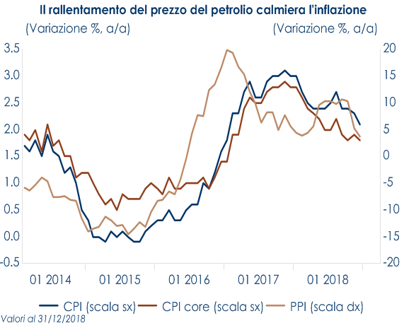 In dicembre gli ordini manifatturieri tedeschi hanno registrato un calo marcato (-1,6% m/m mentre il consenso prevedeva un aumento dello 0,3%). La debolezza è stata una conseguenza della forte contrazione degli ordini all’esportazione. Tuttavia, il tasso a tre mesi ha continuato a crescere dello 0,3% t/t inT4 2018, dopo il calo pari a -1% in T3. Si è registrata anche una forte volatilità tra le varie categorie: gli ordini di beni intermedi sono diminuiti dell’1,2% m/m, gli ordini di beni strumentali del 2,5%, mentre gli ordini di beni di consumo sono aumentati del 4,2% m/m. Questo nuovo calo degli ordinativi evidenzia che la crisi non sembra essere finita e che il momentum sta continuando a rallentare. L’inversione dei fattori una tantum come la siccità del Reno e il cambio WLTP nell’industria automobilistica potrebbero riportare l’economia alla crescita in T1. Anche la produzione industriale tedesca di dicembre è diminuita dello 0,4% m/m (consenso 0,3%, valore precedente 0,0%). Questo rappresenta il quarto calo consecutivo, ma la ripartizione ha visto il primo aumento della produzione industriale al netto della componente delle costruzioni pari a 0.2% m/m. Su base trimestrale, il calo è moderatamente rallentato a -1,5% t/t in T4 dopo -1,7% in T3. Alcuni analisti sell-side stanno valutando positivamente che il rallentamento potrebbe aver toccato il fondo. Tuttavia, con le imprese tedesche sempre più preoccupate per la Brexit e le tensioni commerciali ancora prevalenti, le prospettive di crescita modeste dovrebbero continuare a crescere in T1 2019. Le vendite al dettaglio nell’Area Euro sono diminuite dell’1,6% m/m a dicembre, in linea con il consenso, dopo che il mese precedente erano salite di 0,8% m/m (rivisto al rialzo da0,6% m/m), guidate dal rallentamento in Germania e traducendosi in un aumento pari a 0.8% a/a. Il dato congiunturale risente di contrazioni delle vendite in tutti i settori ad eccezione dei carburanti per autoveicoli che salgono di 0,5% m/m come a novembre, probabilmente grazie al calo dei prezzi delle benzine. La CE ha rivisto al ribasso le proprie stime di crescita e inflazione per i paesi membri dell’UE, rispetto alle previsioni di novembre sottolineando inoltre che le sue proiezioni sono soggette a rischi al ribasso a causa di un elevato livello di incertezza. Secondo la Commissione, l’Area Euro dovrebbe concludere il 2018 in espansione a 1,9%, (previsione di novembre era pari a 2,1%) e le previsioni di crescita per il 2019 passano a 1,3% dal precedente 1,9% e a 1,6% da 1,7% nel 2020. Tra le principali economie le revisioni più importati sono destinate a Italia e Germania. L’economia domestica, dopo aver concluso il 2018 intorno a 1,0% (1,1% nelle previsioni di autunno), dovrebbe rallentare a 0,2% nel 2019 e 0,8% nel 2020, un significativo ridimensionamento rispetto a 1,2% per il 2019 e 1,3% per il 2020 stimati a novembre. La revisione è spiegata da un rallentamento superiore al previsto nel 2018 che, amplificato da maggiori incertezze globali e domestiche, offusca lo scenario per gli investimenti. La dinamica dei consumi dovrebbe restare positiva così come il commercio internazionale, che dovrebbe conferire un marginale apporto positivo alla crescita nel 2019. Più contenuti invece i tagli per Francia e Spagna, che dovrebbero crescere rispettivamente a 1,3% e 2,1% nel 2019, le stime autunnali erano per un’espansione intorno a 1,6% e 2,2%. Sono state riviste al ribasso anche le previsioni per gli indici dei prezzi: a novembre la CE prevedeva un rafforzamento dell’inflazione a1,8% nel 2019 mentre ora, dopo aver concluso il 2018 a 1,7%, l’inflazione dell’Area dovrebbe rallentare a 1,4% nel 2019 e a 1,5% nel 2020, stima anch’essa rivista al ribasso di un decimo.