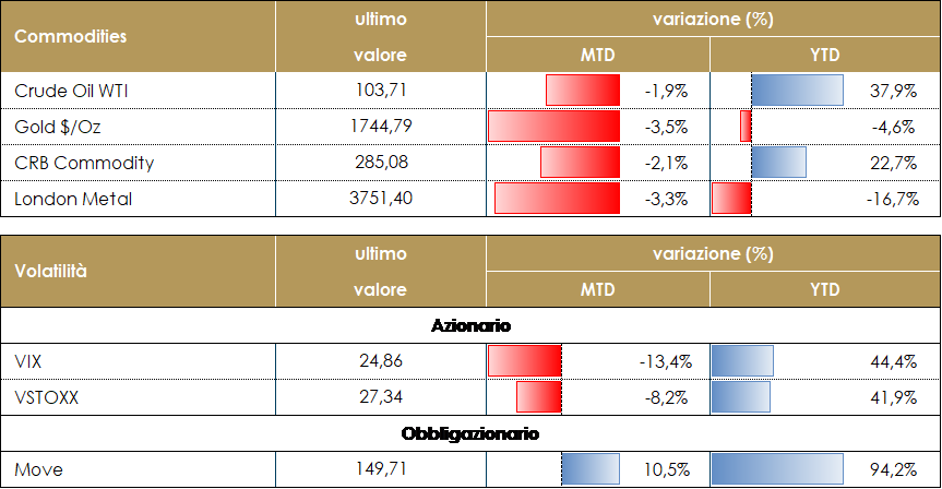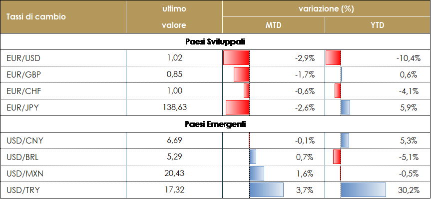 Il prezzo del petrolio si attesta sopra i 100 dollari al barile dopo una settimana volatile in cui è sceso a 95 dollari al barile, il livello più basso dal 12 aprile, a causa dei timori di recessione e al calo della domanda nella seconda parte dell’anno. I timori di un raffreddamento dell’economia sono stati esacerbati da alcuni elementi tecnici e dalla chiusura di operazioni di una più ampia copertura contro l’inflazione. Inoltre, secondo Bloomberg gli Stati Uniti stanno iniziando a discutere con gli alleati di un tetto massimo per il petrolio russo a 40-60 dollari al barile. Tuttavia, permane un certo scetticismo sul fatto che i tetti di prezzo possano funzionare, in quanto richiederebbe la cooperazione dei principali acquirenti russi, Cina e Russia, mentre l’UE dovrebbe probabilmente concedere deroghe al recente divieto imposto dal blocco sul petrolio russo. Il TTF (il gas europeo) ha toccato in settimana i 185 euro, a causa della riduzione delle forniture in Europa e sui timori che un possibile utilizzo strumentale delle attività di manutenzione, (che inizieranno l’11 luglio) del gasdotto Nord Stream da parte del presidente russo Putin possa portare ad ulteriori riduzioni nelle forniture di gas all’Europa, riduzioni delle forniture che rischierebbero di mettere in crisi il sistema energetico tedesco. Per questo, il vicecancelliere tedesco Habeck ha chiesto al Canada di favorire l’invio della turbina Siemens bloccata dal governo di Ottawa come sanzione alla Russia (Gazprom) per l’invasione dell’Ucraina. TASSI DI CAMBIO Il dollaro si è apprezzato durante la scorsa settimana, raggiungendo un massimo da oltre 20 anni verso la fine della settimana (indice del dollaro a 107,4 venerdì). Il deterioramento del sentiment di mercato, dovuto alle preoccupazioni per la crescita, ha mantenuto elevati i flussi verso beni rifugio come i titoli del Tesoro americano ed il dollaro. Nell’Eurozona, il notevole aumento del prezzo del gas registrato dopo la riduzione del 60% del volume importato in Germania attraverso Nordstream 1, ha esacerbato la percezione dell’attuale situazione economica dell’Eurozona come stagflazionistica, un mix che non favorisce la valuta europea. L’euro è passato da 1,048 a meno di 1,01 durante la settimana; sebbene il movimento appaia al momento eccessivo rispetto al differenziale dei tassi, è difficile non prevedere una rottura della parità nelle prossime settimane, in particolare se i prezzi dell’energia continueranno ad aumentare. Il dollaro australiano è riuscito a chiudere la settimana flat rispetto al dollaro: il miglioramento del PMI cinese e l’annuncio di un sostegno fiscale di 200 miliardi di dollari da parte delle autorità cinesi sono stati alla base della forza dell’AUD, uno dei principali beneficiari della ripresa cinese. Il dollaro è stato troppo forte per tutte le valute dei mercati emergenti, tranne che per il Renminbi: la valuta cinese è stato sostenuto dalle notizie positive diffuse durante la settimana. Tra i peggiori ci sono state quasi tutte le valute europee: lo Zloty polacco, il Fiorino ungherese, il Leu rumeno hanno subito perdite superiori al 3%, poiché la loro dipendenza dal gas russo mette a rischio le loro economie ora che il prezzo sta salendo ed è sempre meno disponibile. La tendenza in atto potrebbe continuare anche nelle prossime settimane senza alcuna notizia positiva dalla guerra ucraina. A cura del team obbligazionario di Mediobanca SGR |