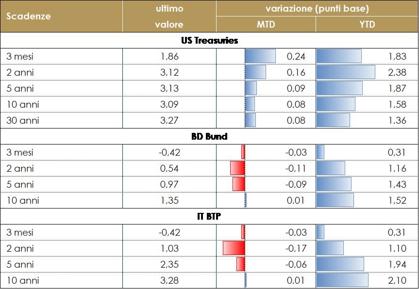 Settimana volatile per il mercato dei titoli obbligazionari. I rendimenti obbligazionari statunitensi durante la settimana sono aumentati sulla scia dell’aumento del term premium e della componente reale. Contestualmente è continuato l’appiattimento della struttura a termine con le scadenze a breve termine cresciute più di quelle a lungo. Invece nell’Area Euro, la struttura a termine ha chiuso la settimana pressoché invariata (variazioni al di sotto dei 10 pb sulle diverse scadenze), pur registrando un’elevata volatilità durante la settimana. I timori circa le ripercussioni negative sulla crescita hanno portato il rendimento del decennale tedesco mercoledì ad un minimo di 1.12%, livello che non si vedeva dalla fine di maggio. La discesa dei rendimenti ha riguardato maggiormente la parte breve della curva, continuando lo steepening in atto da metà giugno con il 2-10 anni di nuovo in area 80pb. Questa settimana è stata la prima in cui la BCE ha potuto utilizzare la flessibilità di reinvestimenti del PEPP per sostenere gli spread. I verbali della riunione di giugno della BCE, pubblicate questa settimana, hanno confermato le attese del mercato lasciando invariati i rialzi scontati nella curva OIS. I verbali mostrano che il Consiglio Direttivo era molto preoccupato per le prospettive dell’inflazione e ritenevano “necessaria un’azione decisa per proteggere l’ancoraggio delle aspettative di inflazione”, in modo che non fossero necessarie misure più drastiche in seguito. Hanno espresso scetticismo nei confronti delle proiezioni sull’inflazione della BCE, osservando che il rischio è sostanzialmente inclinato verso l’alto, ma hanno anche considerato le aspettative lungo termine come “ampiamente ancorate”. Nel complesso, i verbali indicano una chiara attenzione per l’inflazione, mentre le preoccupazioni per la crescita hanno avuto meno risalto, sebbene alcuni membri abbiano sottolineato l’elevata incertezza delle prospettive economiche. L’atteso strumento anti-frammentazione non è stato uno dei principali argomenti di discussione, ma recenti notizie suggeriscono che potrebbe essere ritardato oltre la riunione di luglio. Infatti, ,le attese per il meeting di luglio della BCE riguardano, non solo il primo rialzo dei tassi del ciclo e la comunicazione dei dettagli del programma antiframmentazione, ma anche l’eventualità che la BCE possa introdurre un correttivo per evitare l’arbitraggio delle banche tra il tasso di funding agevolato applicato alla liquidità presa a prestito nell’ambito del TLTRO III e il crescente tasso depo fino al termine di giugno 2023. VIEW STRATEGICA Governativo US Nella riunione di giugno la FED ha annunciato che i tassi di riferimento devono entrare in territorio negativo già quest’anno per contrastare un’inflazione eccezionalmente alta. la domanda dovràrallentare significativamente per generare il rientro dei prezzi, mentre il tasso di disoccupazione dovrà continuare a slaire. Esprimiamo una view neutrale, poiché i livelli raggiunti, in particolare sulla parte breve, incorporano già molto dei rialzi futuri. Governativo EU: Continuiamo ad avere una view negativa sui rendimenti obbligazionari europei alla luce del percorso di politica monetaria annunciato dalla BCE. |