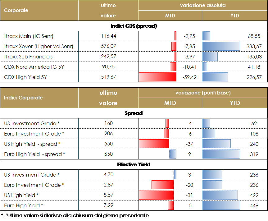 La settimana si chiude con il mercato del credito che registra performance sostanzialmente positive su tutto lo spettro del rating, da quello Investment Grade fino all’high yield. Tuttavia, il deterioramento del sentiment, con operatori sempre più preoccupati per lo scenario di crescita, sia in US che in Europa, ha reso la settimana piuttosto volatile soprattutto in termini di spread. L’attenzione, in Europa, rimane sull’andamento dei prezzi dell’energia: la Russia ha ridotto del 60% il volume del gas esportato in Germania attraverso il gasdotto Nordstream 1 (che deve affrontare un periodo di chiusura per manutenzione), e si temono ulteriori riduzioni (anche a manutenzione terminata). Gli indici CDS in area euro registrano al momento un restringimento settimanale di -2.3 bps per Itraxx Main e -5.6 bps per Xover, dopo che nel corso della settimana sono stati ritoccati i massimi di periodo a 125 bps per il Main e 617 per il Xover. Negli Stati Uniti la dinamica è stata leggermente diversa, in particolare per gli High Yield che soffrono maggiormente il deterioramento del sentiment sulla crescita. Il CDX IG ha stretto nella settimana di oltre 8 bps, mentre il CDX High Yield allarga di quasi 2 bps. Sugli indici cash questa differenza viene meno: sia l’indice IG che quello HY segnano performance assoluta positiva nel corso della settimana. Anche in Europa le performance sono positive per entrambi gli indici cash, guidati dalla discesa dei tassi sulle obbligazioni governative a seguito del repricing delle attese sulle prossime iniziative delle banche centrali. Il mercato primario ha visto nella settimana le emissioni di Intesa (BBB, 300 mio 3y 2.964%) e un Covered di Monte Paschi (AA- 750 mio 2y alla call Floater). A cura del team obbligazionario di Mediobanca SGR Corporate IG: manteniamo una view neutrale: le valutazioni tornate più appetibili e i fondamentali ancora positivi bilanciano il quadro tecnico fragile per domanda e posizionamento. Le alternative di investimento nel fixed income, per quanto tornate positive in diversi comparti del mercato, costituiscono ancora un fattore di sostegno per IG, anche se la rinnovata incertezza e il rialzo delle curve dei tassi rendono le prospettive di total return meno positive. Corporate HY: Outlook neutrale: i fondamentali micro solidi nell’attuale contesto e il recente drawdown che rende le valutazioni più interessanti, supportano la view neutrale ma costruttiva. A livello di allocazione, la preferenza nei comparti ad alto rendimento per i settori finanziari vs corporate e su ciclici vs non ciclici, con una necessaria selettività a livello di emittenti data la concreta evidenza del riemergere del rischio idiosincratico. |