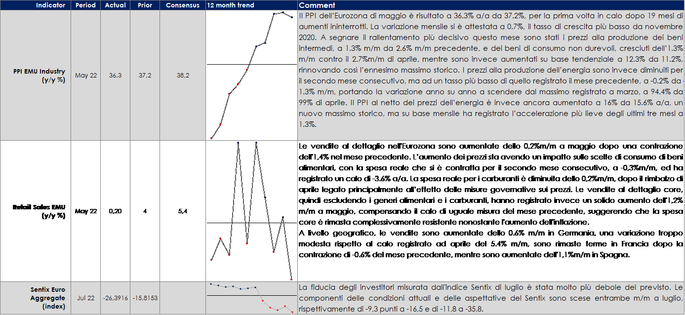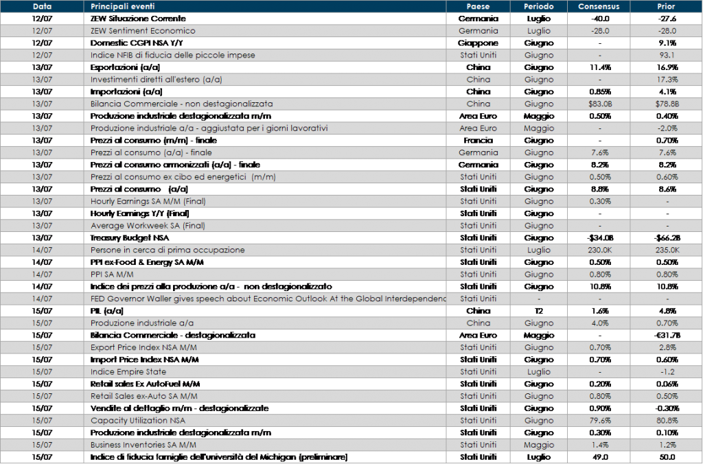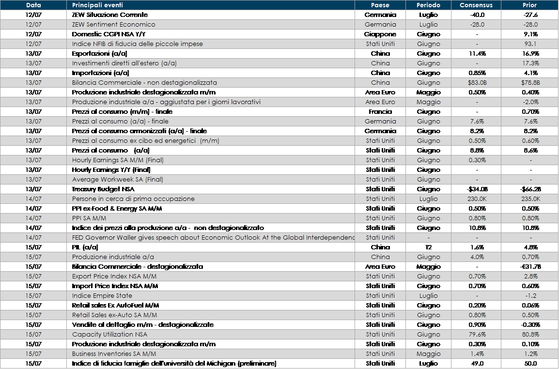 Stati Uniti: la settimana prossima saranno pubblicati tre dati importanti per conoscere l’evoluzione della congiuntura statunitense: le vendite al dettaglio relative al mese di giugno, il dato sull’inflazione al consumo misurata sul CPI relativa al mese di giugno e l’indice di fiducia misurato dall’università del Michigan relativo al mese di luglio. La survey contiene una componente sulle aspettative di inflazione. La combinazione peggiore per gli asset rischiosi sarebbe probabilmente un consumatore debole, unito a pressioni persistenti sul CPI e ad aspettative di inflazione elevate nel lungo periodo.