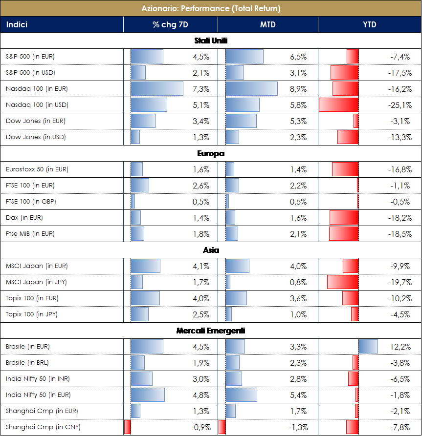 Settimana che si avvia a chiudere positiva per i mercati azionari nonostante la volatilità; centrali rimangono sempre i temi relativi alla guerra Russo-Ucraina, alle chiusure delle forniture di Gas (in Europa), alle dichiarazioni delle Banche Centrali nonché le connesse preoccupazioni sulla crescita del GDP. Il mercato Europeo chiude la settimana a ca +2%, dopo una flessione importante nella giornata di martedì. Stati Uniti, chiusi lunedì per l’Independence Day, positivi in tutte le sedute: S&P500 ca +2% e NASDAQ molto forte a +4,5% ca. Da inizio anno permane ancora il connubio di performance negative sia sull’azionario che sull’obbligazionario. Nella settimana è continuato il trend di discesa delle commodities. Da segnalare la svalutazione dell’eruo che in settimana è arrivato a sfiorare la parità con il USD. Dal mercato, continuano ad arrivare i segnali di “capitulation” con i fondi Azionari che, per la quarta settimana di fila, subiscono continui rimborsi a favore di inflows principalmente verso fondi monetari. In termini di flussi, a soffrire maggiormente sono i settori più ciclici (Energy, Financials,…) mentre beneficiano Health Care, Utilities ed IT beneficiano di inflows positivi. L’indice S&P si avvia a chiudere la settimana con un segno positivo di oltre il 2%, con Auto manufacturer +10%, Interactive Media & Services +9%, Footwear e Drug Retail +7%, i settori migliori; Home forniture -4%, Oil&Gas -4%% i settori peggiori; a livello di singoli nomi migliori performers Moderna +20%, ETSY +12% e ON Semiconductor +11,5%; i peggiori EOG Resources -6%, Fisrtenergy -5,7%. L’Indice Nasdaq 100 positivo a circa +4,5%, con Lucid Group +17,8%, Tesla +11% e Micron Technology + 10,5% i titoli migliori; JD.COM -5%, Pinduoduo -4,7% i titoli peggiori. Segno positivo anche in Europa con l’indice SXXP a ca +2%, trascinata da Real Estate +5.3%, Retail +5%, Tecnologia +4,7% ed Auto +4,5%; negativi Energy -3,75%. L’indice italiano FTSE MIB chiude la settimana intorno a +2%, con Diasorin + 8% ca, Finecobanck a +6%; negative Terna (-3%), Poste Italiane (-2,5%) e Snam -1.5%. +2,5% ca per l’indice delle mid cap italiane trascinato da GVS +13,5%, Pharmanutra +11,5% e Wiit +11%; negativi invece IREN -6.5%, Unieuro e Saras -5%. Si segnala che la prossima settimana vedrà la partenza della reporting season sul Q2/1H: ad iniziare, come di consueto, alcune maggiori banche US (JPMorgan e Morgan Stanley giovedì) che forniranno importanti indicazioni sul contesto economico e sulla spesa dei consumatori; inoltre, giovedì riporterà anche il colosso dei TSMC che potrebbe fornire insight relative all’effettivo stato di salute del settore dei semiconduttori e dei relativi problemi di strozzatura all’offerta. A cura del team Core Equity Value di MB SGR VIEW STRATEGICA: la view sul comparto azionario continua ad essere costruttiva. Tra i principali rischi evidenziati la normalizzazione della politica monetaria sembra ormai abbondantemente prezzata lasciando così presagire un suo minor impatto nei mesi futuri. Il perdurare della guerra in Ucraina e l’effetto dei lockdown in Cina restano come elementi di rischio al momento bilanciati dalle dinamiche positive degli utili societari che mantengono le valutazioni dei listini su valori storicamente interessanti. Azionario USA: il ciclo economico (pur in rallentamento) è ancora favorevole; nell’attuale contesto geopolitico l’area statunitense appare favorita alla luce di differenti fattori: l’indipendenza energetica la rende meno fragile ai rialzi dell’oil, il livello dell’interscambio commerciale con la Russia è modesto, la composizione dell’indice azionario la rende meglio posizionata a fronte di una Fed che dovesse mostrarsi meno aggressiva di quanto già prezzato dai mercati Azionario Europe: la situazione geopolitica ed in particolare la dipendenza energetica dalla Russia stanno riducendo il ritmo di espansione dell’economia gravando sull’inflazione. In tale contesto la normalizzazione della politica monetaria si configura come rischio aggiuntivo. |