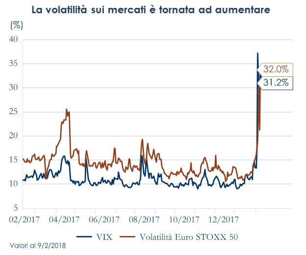 | La marcata correzione del mercato azionario di questa settimana è stata innescata dal timore che una fiammata inflazionistica possa portare ad un cambiamento della funzione di reazione delle banche centrali, aumentando il ritmo di inasprimento della politica monetaria, con un contestuale aumento del premio per il rischio di inflazione, del term pemium (quindi dei rendimenti dei titoli governativi) e un conseguente restringimento delle condizioni finanziarie. Il movimento ha portato con sé un aumento della volatilità implicita a breve termine, risultandone a sua volta amplificato. Lunedì il VIX è balzato in sole due sedute da livelli storicamente compressi (sotto i 15 punti) a 37,32 punti (chiusura di lunedì) segnando con un +116%, la variazione percentuale più alta di sempre. In passato, il VIX ha registrato una variazione superiore al 50% in sole altre quattro occasioni (il 8/8/2011 in occasione del downgrade da parte di S&P del debito degli Stati Uniti, il 27/02/2007 in occasione del calo nel mercato azionario cinese, oltre che il 15/11/1991 e durante la guerra del Golfo il 23/7/1990). L’aumento della volatilità implicita a breve termine ha innescato chiusure delle posizioni lunghe da parte dei gestori sistematici (volatility targeting, risk parity, CTAs, short volatility), esacerbando ulteriormente il movimento ribassista sui mercati azionari. Anche il secondo calo del mercato azionario, verificatosi giovedì, ha coinciso con un altro aumento della volatilità, con il VIX salito di un altro 21% a 33.5. Nell’ultimo periodo del 2017 il clima esuberante e la solidità dei fondamentali macroeconomici erano coincisi con ripetuti cali della volatilità implicita delle azioni e delle obbligazioni. Statisticamente si rileva che la bassa volatilità tende a formare dei cluster e di solito riflette fondamentali macroeconomici solidi, facendo aumentare la propensione al rischio degli investitori. Negli ultimi cinque anni, gli investitori di fatto, alla ricerca di rendimento, sono stati venditori giornalieri di volatilità (il volume giornaliero delle opzioni sul VIX è passato da 23.000 nel 2006 ai 3 milioni di oggi) e la pressione al ribasso sulla volatilità implicita si era tradotta sistematicamente in una spinta rialzista per le attività rischiose.