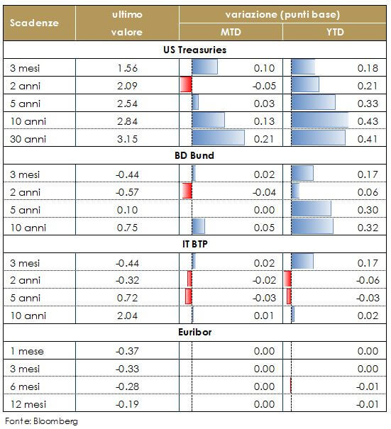 I rendimenti dei principali titoli governativi hanno continuato a salire.Alla base dell’aumento dei rendimenti dei titoli governativi statunitensi c’è la rimodulazione delle aspettative sui futuri rialzi della Fed, ma anche le preoccupazioni per un futuro ampio disavanzo di bilancio negli Stati Uniti.Tali preoccupazioni si sono amplificate dopo la discussione dell’accordo di bilancio bipartisan al Senato. Il piano aggiungerebbe altri 500B di dollari in nuove spese per due anni e sospendere il tetto del debito fino al 2019. E’ importate sottolineare che In settimana diversi esponenti della Fed hanno cercato di calmierare i timori connessi con il marcato sell-off dei mercati azionari e l’aumento della volatilità, segnalando che è improbabile che la Fed modifichi il corso della sua politica, dati i fondamentali forti dell’economia USA. Il presidente uscente della Fed di New York, Dudley (elettore), ha sottolineato che la recente correzione dei mercati azionari non sarà causa di revisione della politica monetaria della Fed. Il presidente della Fed di Dallas, Kaplan, ha osservato che le correzioni del mercato possono essere salutari e che attualmente non vi sono implicazioni negative per i fondamentali dell’economia. A sua volta presidente della Fed di St. Louis ha rimarcato che il recente calo del mercato azionario deve essere letto alla luce delle elevate valutazioni dei titoli tecnologici e che potrebbe trattarsi di una correzione fisiologica. Sui titoli governati europei ha invece pesato l’esito della riunione di politica monetaria della BoE. Giovedì i Gilt 10Y sono saliti 1,62%, il dato più alto da maggio 2016, sulla scia delle attese di un anticipato rialzo da parte della BoE. Anche i rendimenti dei bund sono aumentati con gli investitori che continuano a rivalutare le prospettive di “early tapering” da parte della BCE. |