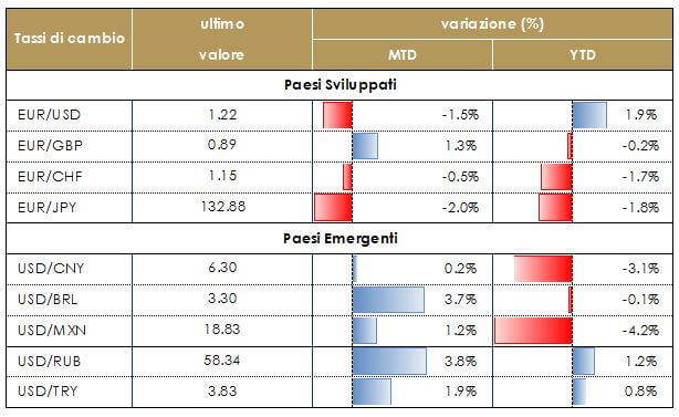 Riteniamo che l’evoluzione della politica fiscale negli Stati Uniti e la rimodulazione delle attese future da parte della Fed guideranno il tasso euro-dollaro fino alla fine dell’anno. |