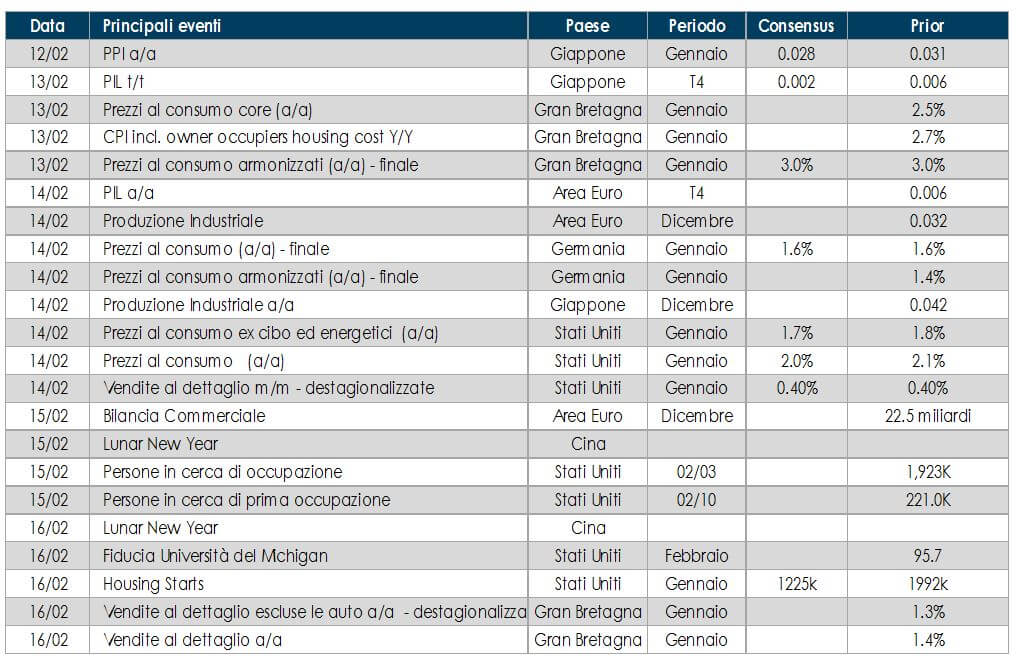 - Stati Uniti: inflazione di gennaio sotto i riflettori anche per gli Stati Uniti, insieme a produzione industriale e qualche dato sul mercato immobiliare, tra cui le nuove costruzioni abitative.