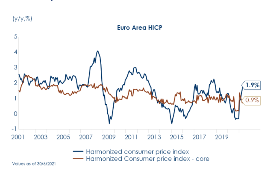 | La BCE è stata meno chiara rispetto alla Fed nel definire il suo cambiamento di strategia. La BCE lascerà spazio per superare il nuovo obiettivo del 2% se necessario. Non è però chiaro se questo superamento dell’inflazione debba essere semplicemente tollerato (dato che è inevitabile in questa fase) o se la BCE debba seguire la Fed nell’incoraggiare un’inflazione superiore al 2% (poiché l’inflazione è stata inferiore all’obiettivo per molti anni – Fig. 1). Durante la conferenza stampa, il presidente Lagarde ha complicato ulteriormente la definizione di stabilità dei prezzi, affermando ripetutamente che la politica monetaria avrebbe bisogno di essere “particolarmente forte o persistente” in caso di shock negativo dell’inflazione, a causa dei rischi associati al limite inferiore dello zero. Quindi, mentre l’obiettivo è simmetrico, la risposta politica alle deviazioni da esso può essere diversa. Tale messaggio appare po’ confuso, ma riteniamo che la strategia della BCE dovrebbe evolversi nella stessa direzione della mossa della Fed, ovvero verso l’inflazione media. | Fig.1: Eurozone core inflation has stayed below target for almost 20 years |