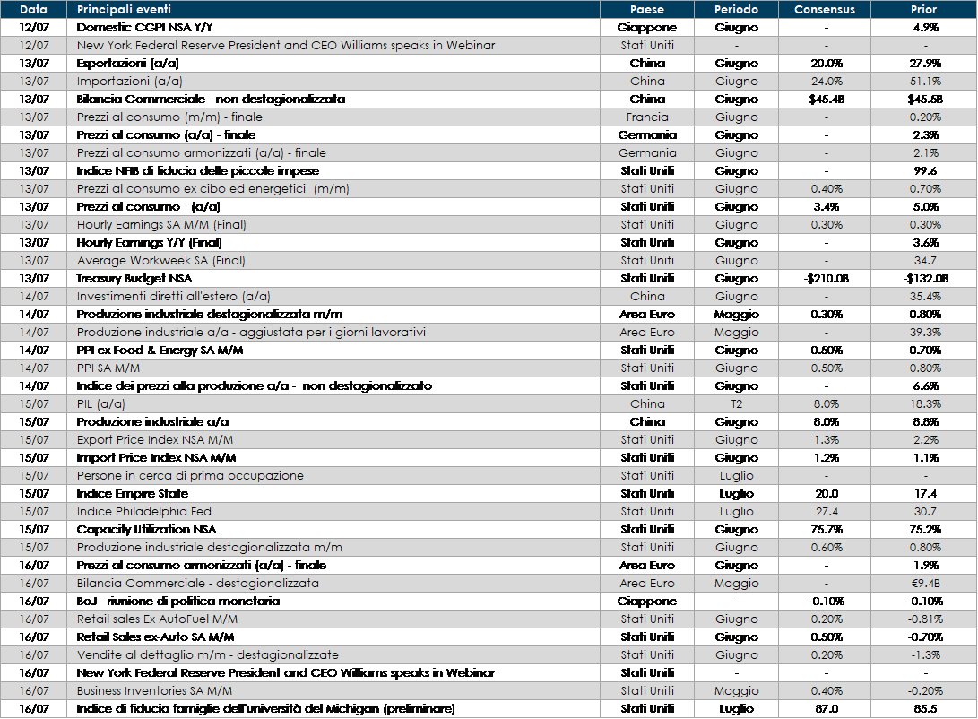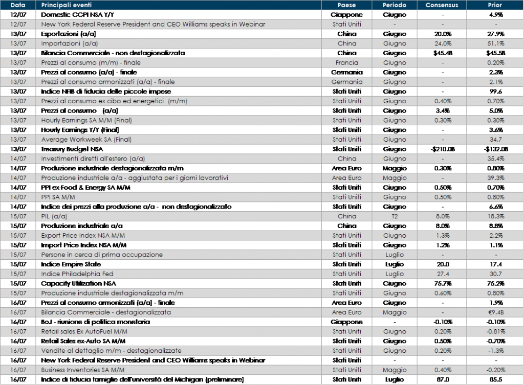 - Stati Uniti: la prossima settimana l’attenzione sarà rivolta alla pubblicazione del dato di inflazione e della crescita delle vendite al dettaglio;