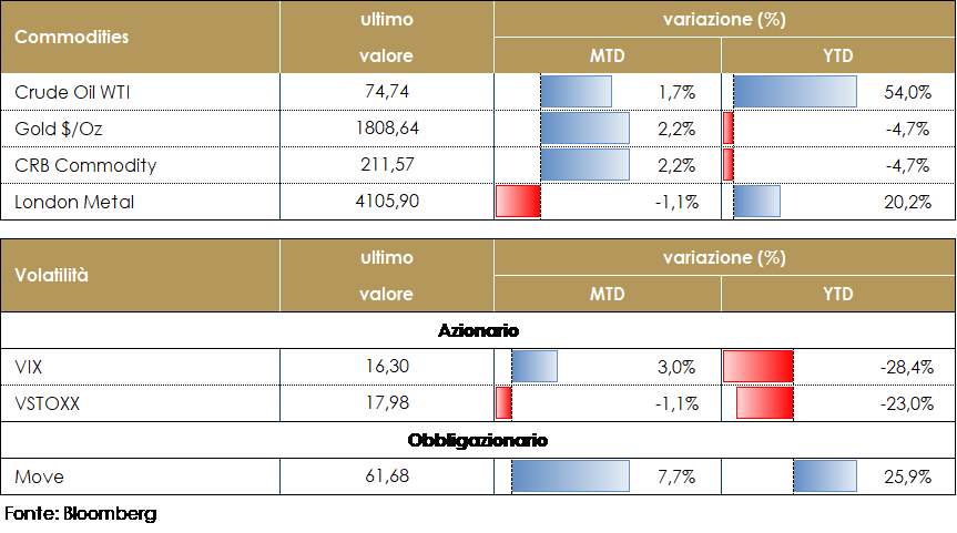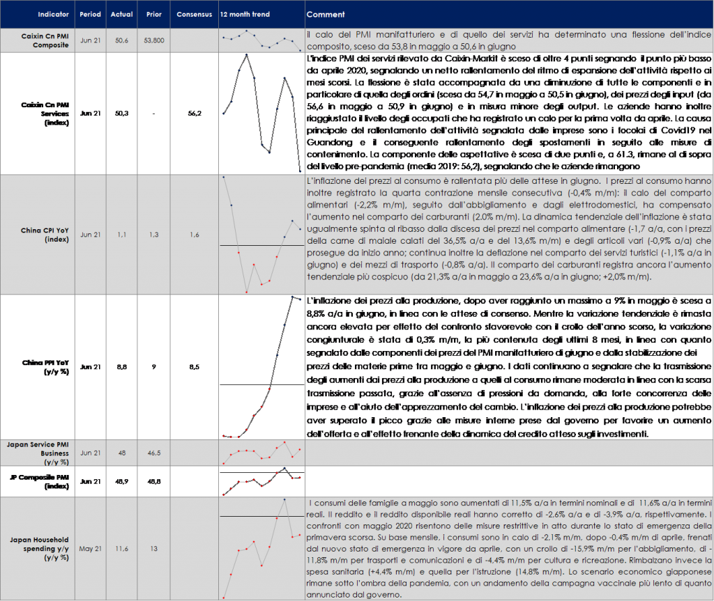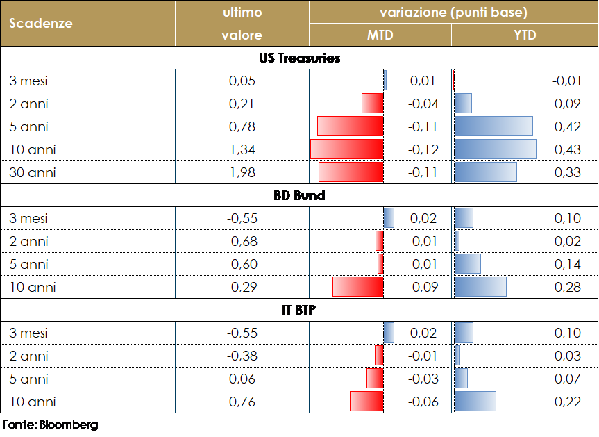 I rendimenti governativi a lungo termine statunitensi sono scesi significativamente durante la settimana appena conclusasi. Il decennale US è sceso sotto 1.3% per la prima volta da febbraio. Il movimento ha riflesso timori sia di una Fed meno accomodante sia per la crescita economica (dopo la pubblicazione di alcuni dati al di sotto delle aspettative e il crescente timore sui possibili impatti della variante Delta), ma è stato esacerbato da fattori come l’acquisto di CTA (Commodity Trading Advisor) e la copertura a breve. In realtà i verbali della riunione del FOMC di giugno hanno riservato poche sorprese e hanno ribadito il messaggio già espresso durante la conferenza stampa. I verbali riportano, come atteso, una diffusa sorpresa per il miglioramento dello scenario economico e per l’aumento dell’inflazione rispetto a quanto atteso in precedenza, grazie anche ai risultati positivi della campagna vaccinale. Le informazioni dei verbali sono in linea con quanto emerso dalla riunione stessa e dai molti discorsi dell’ultimo mese, senza nuovi dettagli di rilievo. Il messaggio in generale è non è più hawkish rispetto a quello della riunione di giugno, ma riporta la volontà del FOMC di essere preparati ad agire in caso di ulteriori sorprese.In Cina, invece, il timore di un rallentamento della crescita economia e degli effetti sulle piccole imprese della recente impennata dei prezzi delle materie prime ha portato la PBoC a tagliare il tasso di riserva obbligatorie per le banche (RRR), seppur ribadendo che non c’è alcun cambiamento nella strategia di politica monetaria, che resta più prudente. La decisione sarà effettiva a partire dal 15 luglio. Anche l’Area Euro ha partecipato a questo movimento risk-off, con breakeven inflation notevolmente più basse, spread sui titoli periferici più ampi e un calo del decennale tedesco. Inoltre, la Bce ha votato all’unanimità la nuova strategia di politica monetaria.Il mercato ha interpretato la conferenza stampa seguita alla pubblicazione della strategia come un evento dovish, che innalzerebbe la probabilità che politiche accomodanti continuino in presenza di temporanei overshoot dell’inflazione. L’annuncio ha dato un iniziale impulso al comparto obbligazionario europeo, facendo toccare al 10y Bund il minimo degli ultimi 3 mesi a -0.345%, quasi 5 bps in meno rispetto alla chiusura precedente. Tuttavia, dopo la conferenza i rendimenti è tonato attorno a -0,30%. PERFORMANCE DEI TITOLI GOVERNATIVI – Dati aggiornati alle 17.30 del 9 luglio 2021 VIEW STRATEGICA Governativo US: Le attese di un continuo sostegno monetario e la considerazione di temporaneità dell’aumento dell’inflazione hanno fatto diminuire la volatilità sui titoli obbligazioni. I rendimenti governativi statunitensi sono scesi nell’ultimo mese guidati da un calo del term premium. Esprimiamo una view neutrale. Governativo EU: I titoli governativi europei dovrebbero evidenziare un decoupling da quelli statunitensi, sulla scia delle aspettative di un ulteriore allentamento monetario da parte della BCE. A giugno la BCE, pur fiduciosa sulla ripresa, ha confermato che gli acquisti netti relativi al PEPP avverranno ad un ritmo significativamente superiore a quello di inizio 2021 dichiarando prematuro e non necessario un qualsiasi cambiamento dei parametri di politica monetaria. |