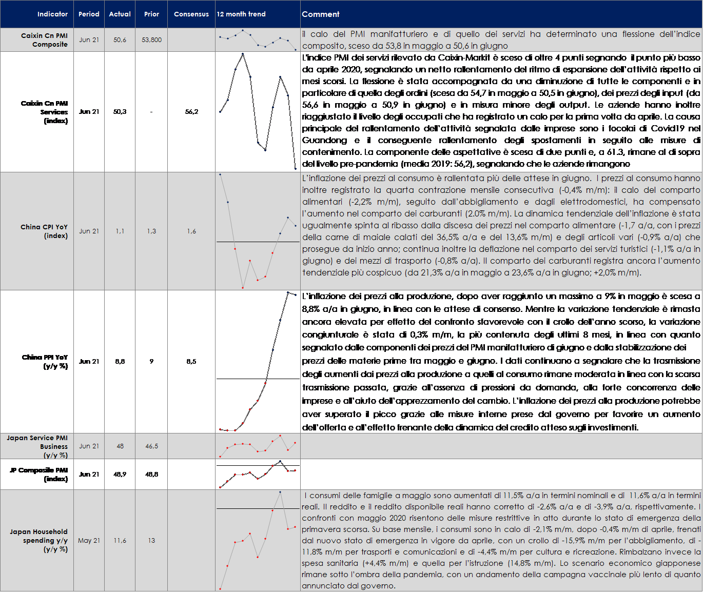 - Asia: in Cina saranno pubblicati i dati relativi alla bilancia commerciale nel mese di giugno, mentre in Giappone si terrà ala riunione di politica monetaria.