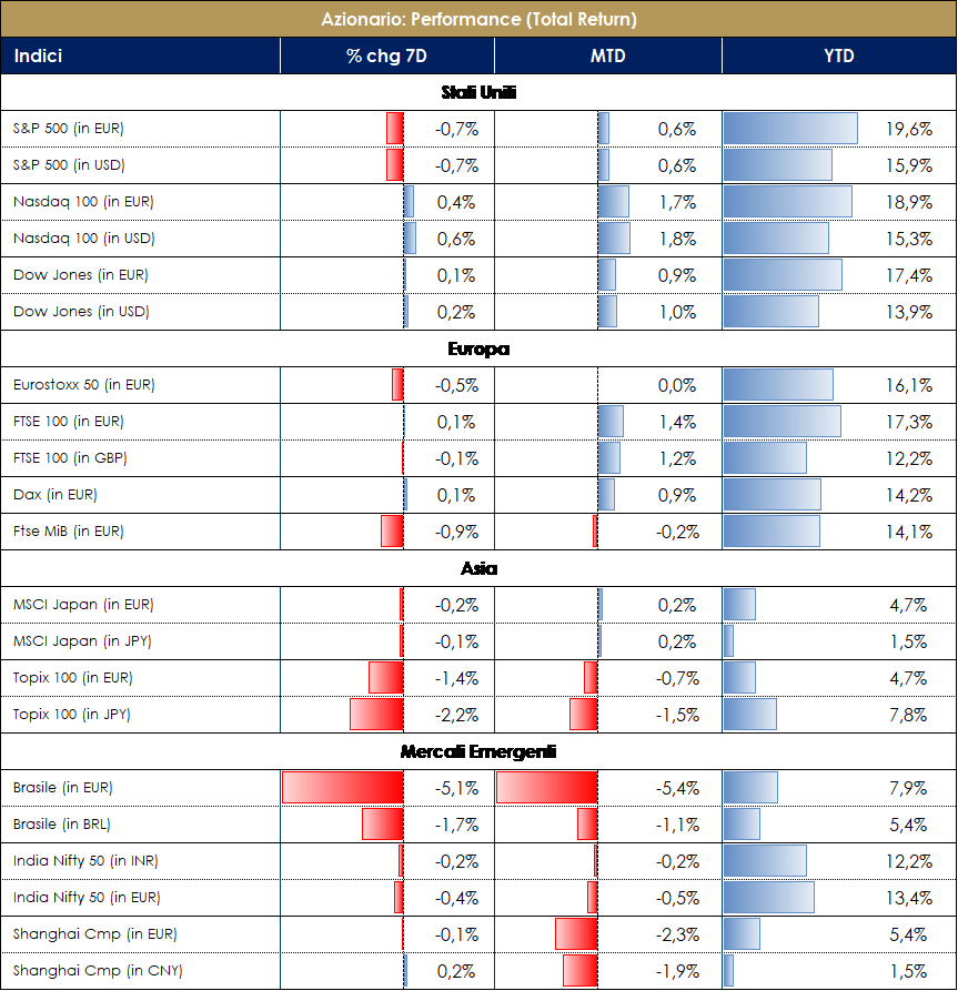MERCATI AZIONARI Si indeboliscono le convinzioni di “reflation trade”: il mercato stenta a credere alle previsioni di crescita e il value torna a soffrire Settimana (giornata) di risk-off sul mercato azionario complici i timori di nuove ondate covid dovute alla variante Delta e il freno alle previsioni di crescita, nonostante la revisione al rialzo delle stesse (4.8% dal precedente 4.3%) e di inflazione (1.9% dal precedente 1.7%) da parte della Commissione Europea. I listini azionari hanno ulteriormente accentuato il trend ribassista dopo i dati sul mercato del lavoro statunitense e dopo la pubblicazione della strategia di politica monetaria da parte della BCE. Nonostante il tentativo della BCE di allinearsi alla politica intrapresa dalla FED sul futuro tapering, il mercato ha dimostrato di non credere completamente al timing di rialzo dei tassi ma all’esigenza di sostenere ancora la ripresa. Il mercato sembra essersi ancora una volta concentrato molto di più sui dati leggermente peggiori del previsto (l’aspettativa crea delusione), sulla base di una politica monetaria di fatto ancora espansiva da parte delle banche centrali a dimostrazione della necessità di ulteriore sostegno. Nonostante le piene valutazioni (forward 12 mesi P/E dell’S&P500 a 21.4x vs media storica a 5 anni di 18.1x e a 10 anni di 16.1x) e le già note aspettative di reporting season ampiamente prezzate nelle stime degli analisti, il posizionamento degli investitori rimane lungo sull’equity. Da una recente survey nel mondo degli Hedge Fund si evince come la net-exposure sia in costante crescita da 5 settimane consecutive a questa parte. Dopo il mancato accordo OPEC+, il prezzo del greggio ha ritracciato sui massimi degli ultimi sei anni (WTI a quota 77$) e la discrepanza con le performance delle Oil companies è sempre più marcata (peggior settore della settimana). Anche sul fronte geopolitico si sono viste ulteriori tensioni tra USA e Cina tramite gli inserimenti in blacklist americane di alcune società cinesi e la vicenda Didi Global Holdings: a pochi giorni dalla quotazione su Wall Street le autorità cinesi hanno “bannato” la possibilità di scaricare l’applicazione. In termini di performance EuroStoxx a -0.70% con Real Estate +2% e Basic Resources +1% a trainare l’indice contro la performance negativa dell’Energy -3.50%, Auto -3%, Banks -2.70% e Travel -2.65% (titoli correlati al ciclo e alla recovery). In termini di single names troviamo Vonovia e SAP (double-upgrade di BoFA ML) tra i migliori della settimana +3% contro Prosus e Daimler a -6%. FTSE MIB -1.60% e ITAMID Cap -1%. S&P500 che chiude positivo a +0.55% (con nuovi massimi registrati nella giornata del 7 luglio: 4361) con Internet Retail Index il best sector +8% e Drug Retail il worst -11%. Nasdaq100 a +1.15% (Amazon +8.50%). A cura del team Core Equity Value di MB SGR PERFORMANCE MERCATI AZIONARI – Dati aggiornati alle ore 17.30 del 9 luglio 2021 VIEW STRATEGICA I dati sull’efficacia dei vaccini hanno innescato una nuova fase di aumento della propensione al rischio. Le componenti forward looking dei principali indicatori anticipatori hanno accentuato la loro accelerazione e i listini azionari hanno reagito con una riduzione dei premi al rischio, un deciso rialzo delle quotazioni e una rotazione settoriale, anche grazie agli ottimi risultati a livello micro. |
